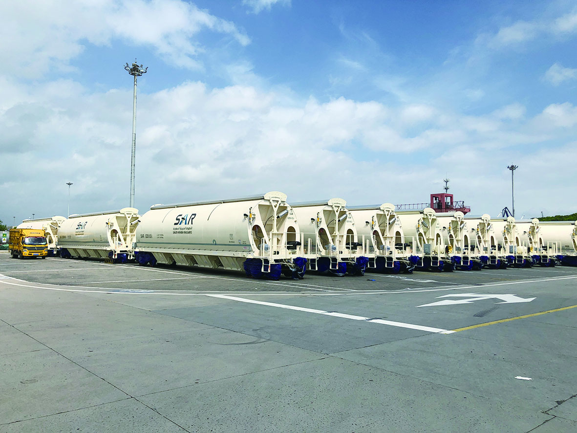 中车株辆公司为沙特制造的65辆磷酸盐漏斗车正在等待发运。 企业供图