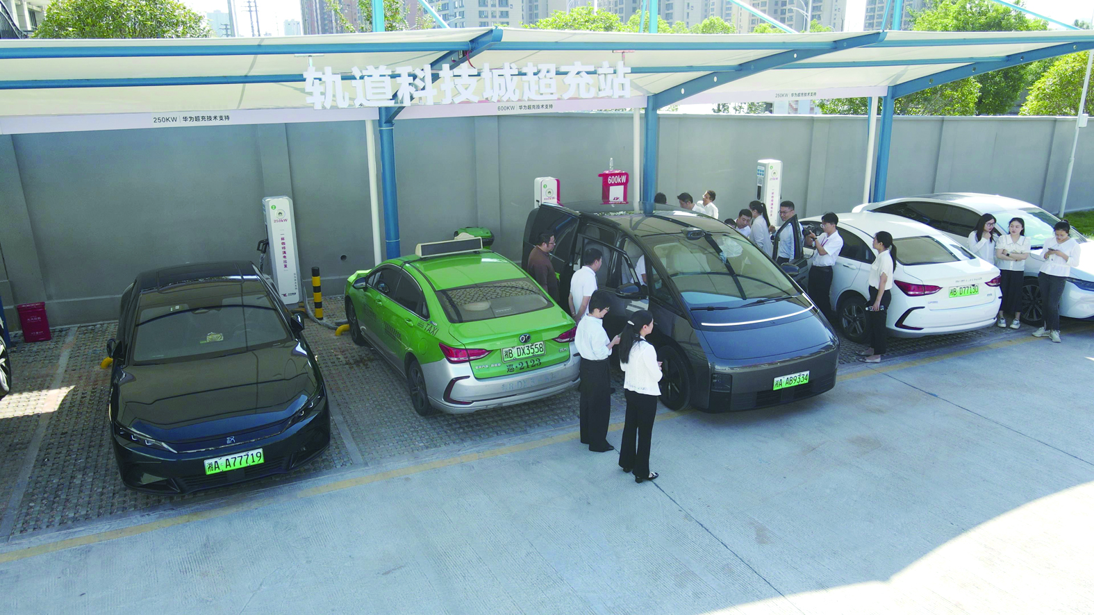 该站由株洲城发集团和中石化株洲石油分公司共同打造。远观新站与传统油站无异,而一边的白篷子及600kW超快充电桩让它“吸睛”不少。新站投用当天许多车主争先前来一瞧究竟,私家车、出租车在站内排起了长龙。