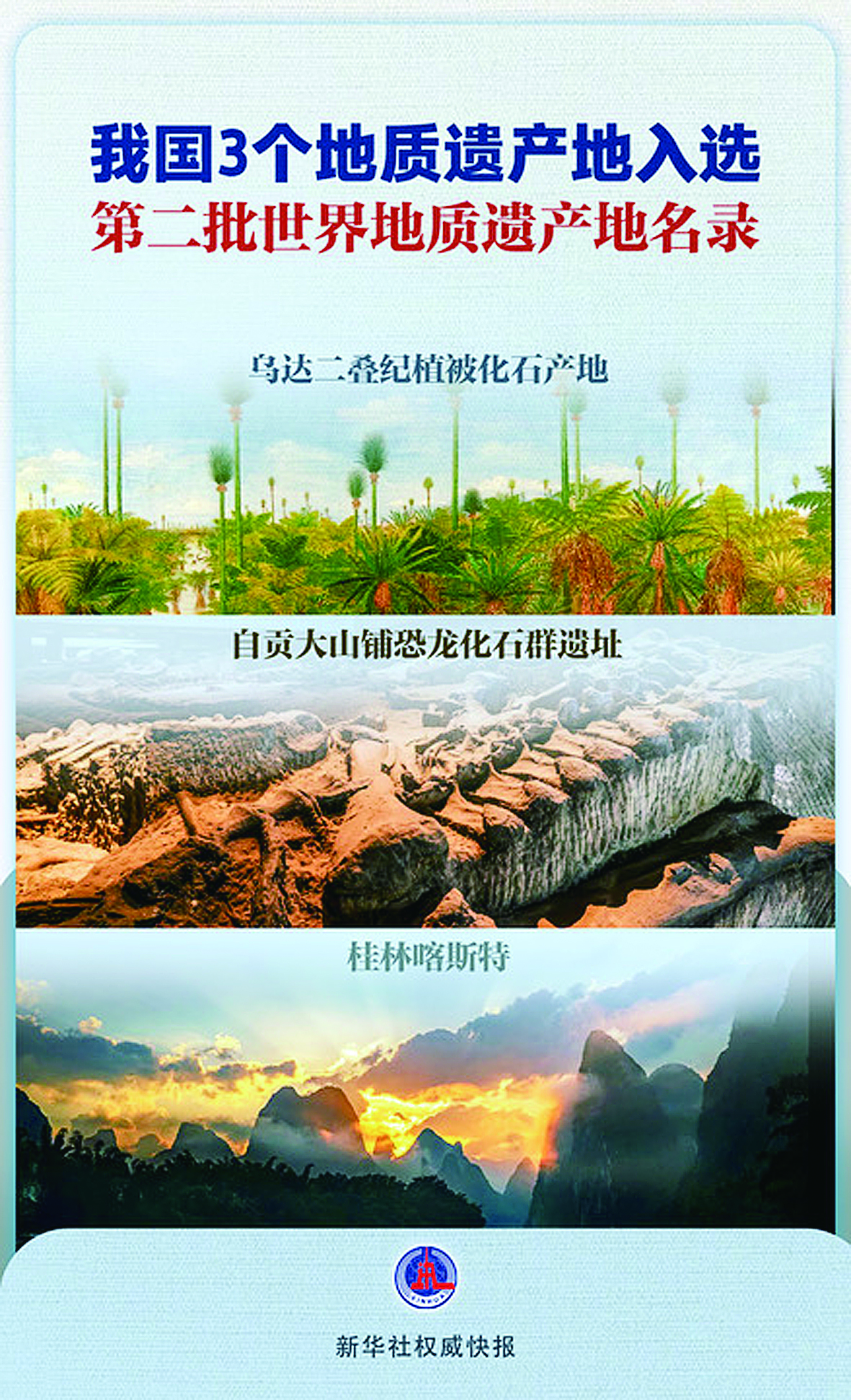 3日,记者从中国科学院在南京举办的新闻发布会上获悉,国际地质科学联合会日前发布第二批100个世界地质遗产地名录,我国有3个地质遗产地入选,分别为:乌达二叠纪植被化石产地、自贡大山铺恐龙化石群遗址和桂林喀斯特。