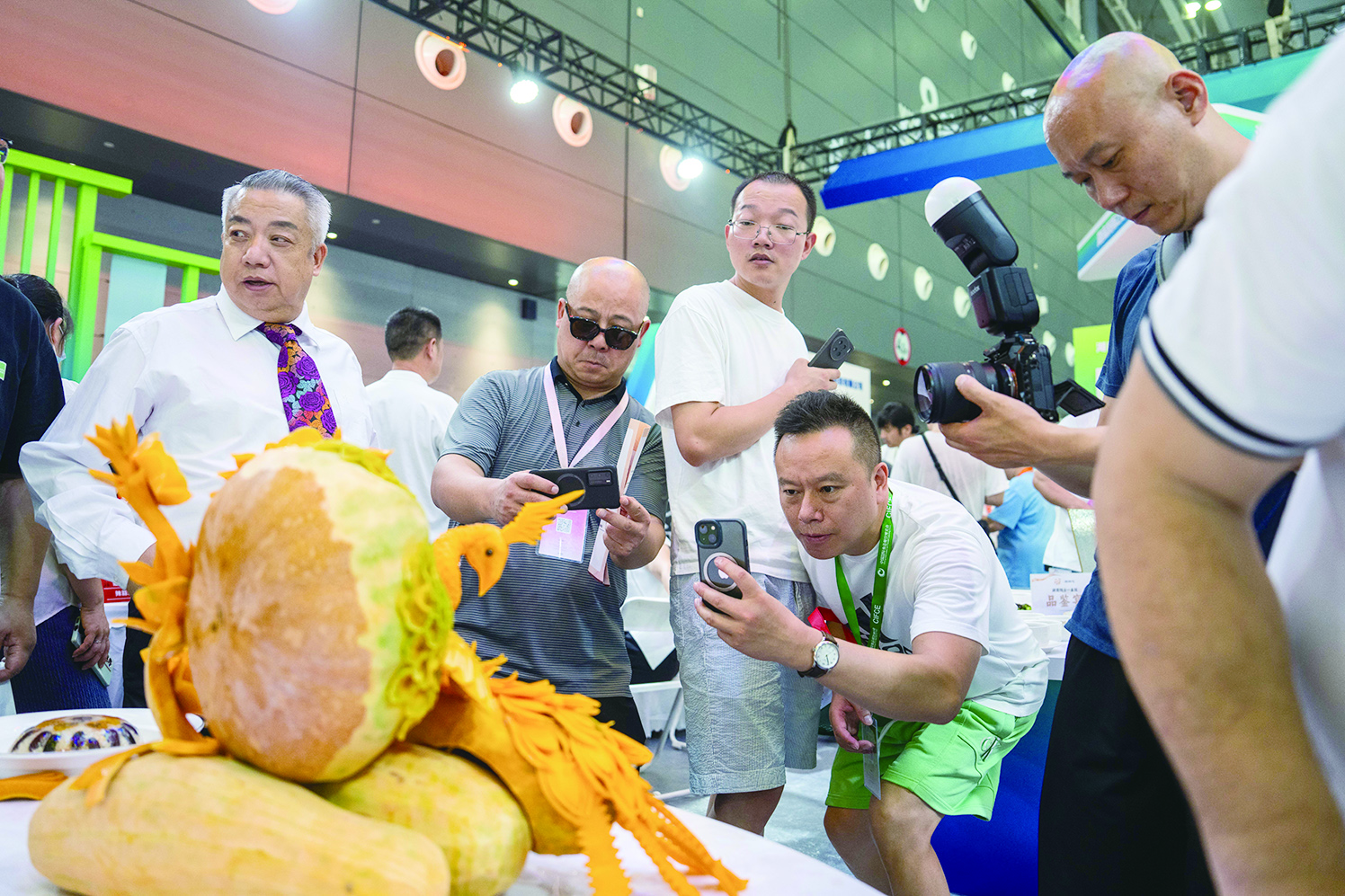 9月6日,第九届中国国际食品餐饮博览会在长沙国际会展中心开幕。博览会以“促进消费,创新发展”为主题,展览总面积7万平方米,国内外参展企业达1000余家,展出各类产品3万多件,集中展示了国内外食品餐饮行业新技术、新产品、新成果。图为当日在长沙国际会展中心,参观者在拍摄展出的南瓜雕花。 新华社记者 陈思汗 摄