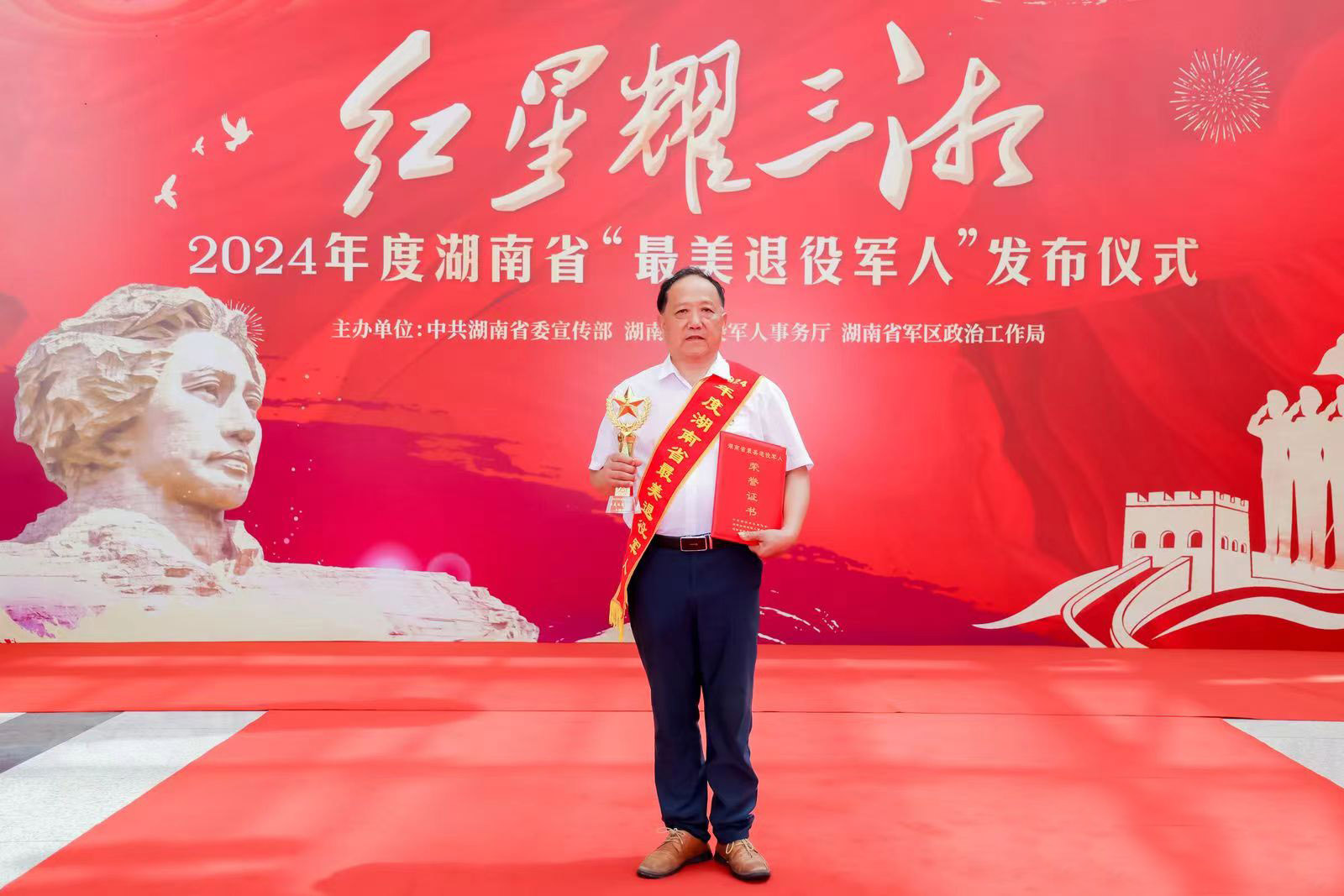 杨凯勤登台领取湖南省“最美退役军人”奖杯与证书。 通讯员 供图