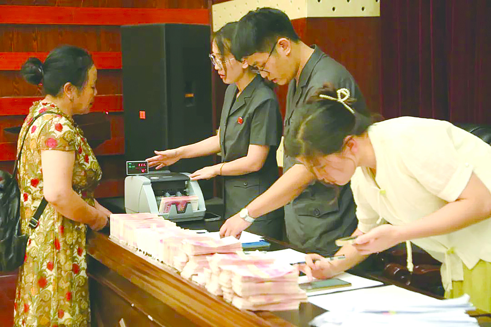 本次兑付的劳动争议纠纷执行系列案件系因株洲某餐饮公司拖欠员工工资而引发。2021年,该餐饮公司因经营不善问题面临倒闭,无奈之下,该餐饮公司与60余名员工解除了劳动合同,但经济补偿金及违约金均未支付到位。2022年,在天元区人民法院组织下,员工与餐饮公司达成调解,然而在之后的两年时间里餐饮公司仍未履行生效法律文书确定的义务。2024年7月,60名员工向天元区人民法院申请强制执行。执行过程中,承办法官迅速开展调查取证,多次上门走访被执行人公司,反复释法析理及协调,打出执行“组合拳”,最终顺利帮助60名员工执行到拖欠已久的工资款,并于当日下午,在天元区人民法院一楼会议室通过现金方式发放了相应款项。