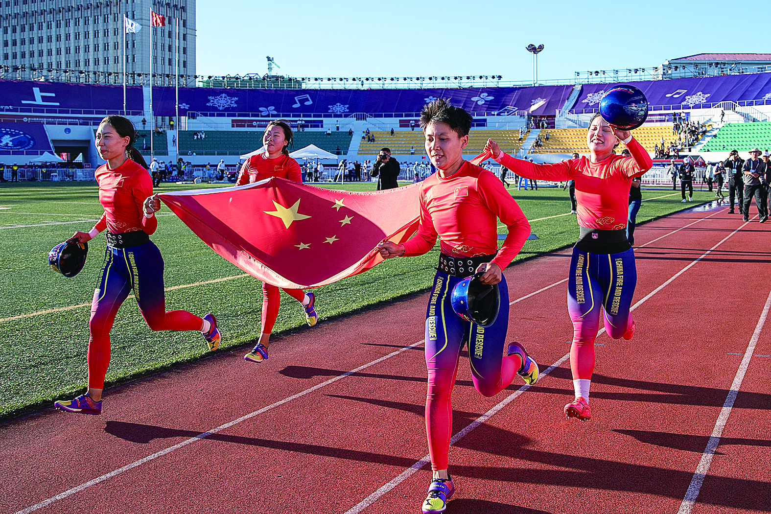 9月10日,在第19届男子和第10届女子世界消防救援锦标赛女子手抬机动泵出水打靶比赛中,首次参赛的中国队选手柴昱、贾琰、周文莉、谭沐熙、牛玉、李春雨、孙硕以25秒64获得冠军。图为当日,中国队选手在女子手抬机动泵出水打靶比赛结束后庆祝夺冠。