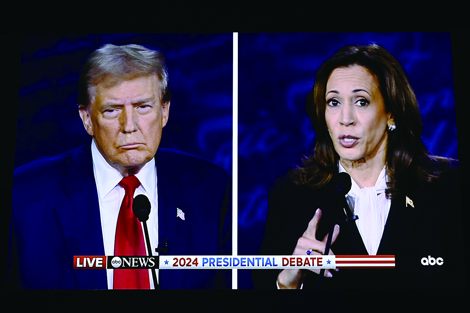 这张9月10日在美国费城总统辩论媒体中心拍摄的视频直播画面显示,美国副总统、民主党总统候选人哈里斯(右)和美国前总统、共和党总统候选人特朗普在费城参加电视辩论。