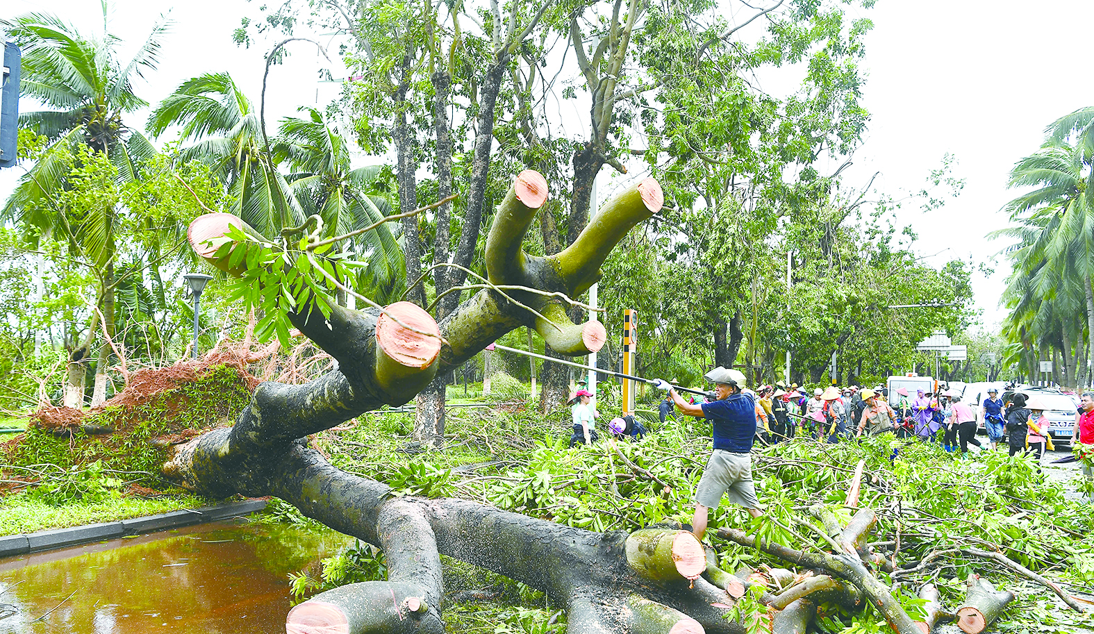 9月7日,工作人员在海口市滨海大道上清理被风吹倒的树木。 新华社记者 杨冠宇 摄