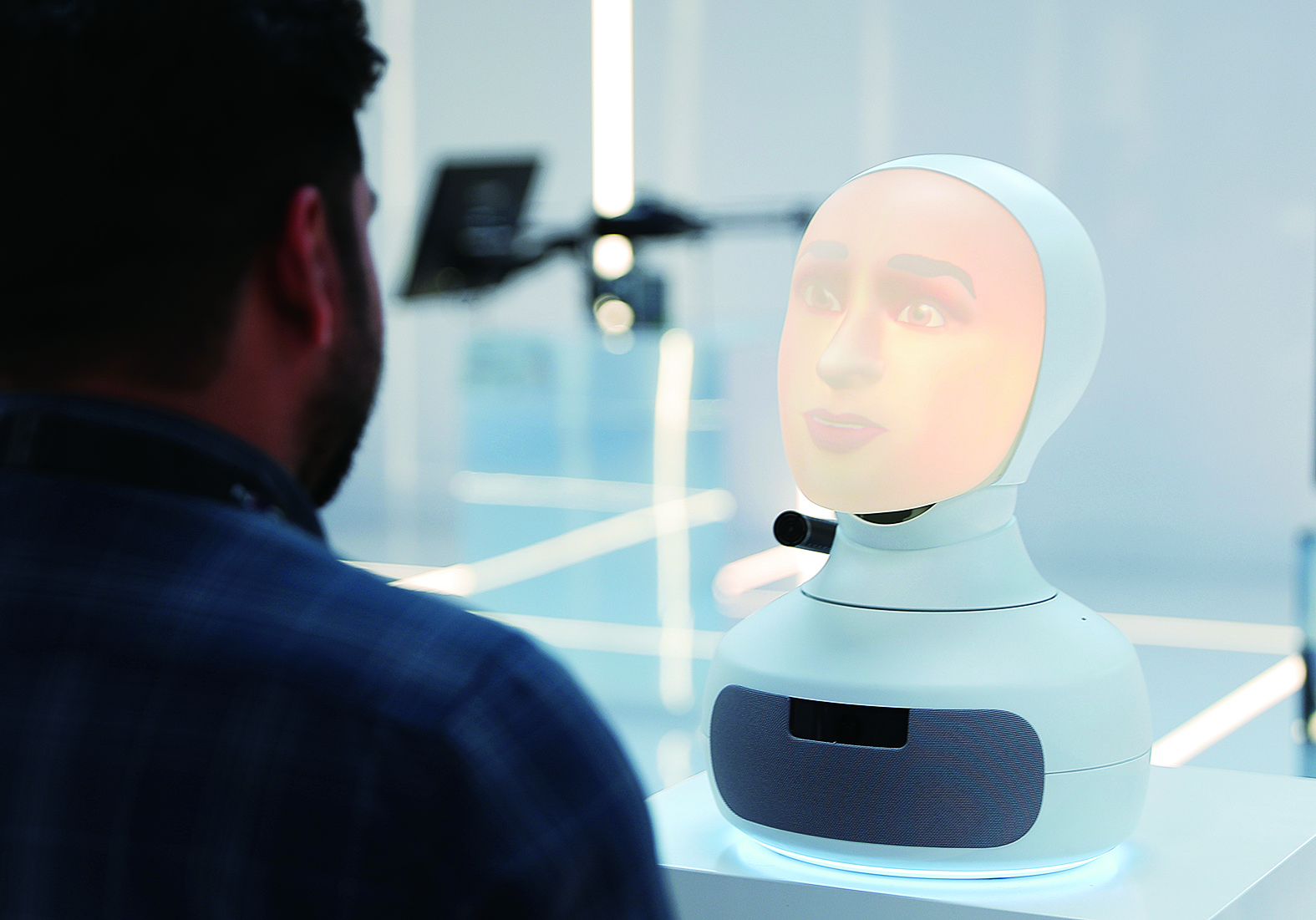 9月12日,在沙特阿拉伯首都利雅得举行的第三届全球人工智能峰会上,一名参会者与“对话机器人”交流。 新华社记者 王东震 摄