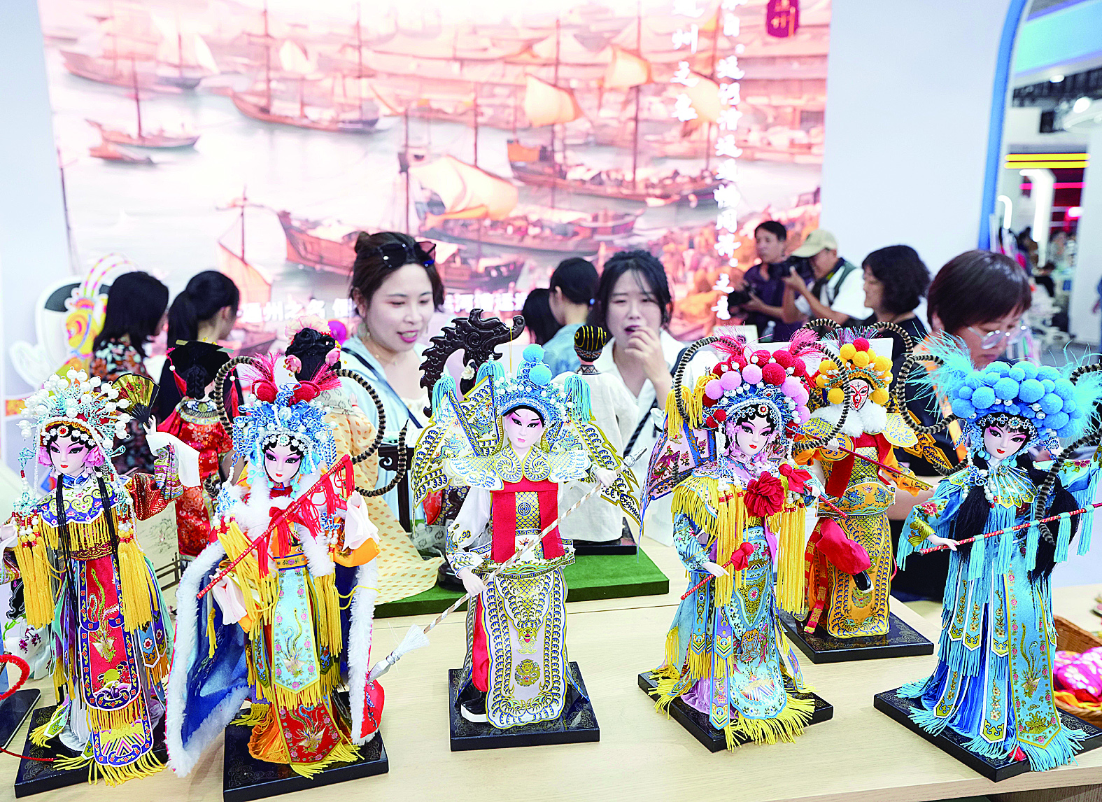9月15日,观众观看服贸会文旅服务专题展区通州展台上的戏曲人物造型摆件。新华社发