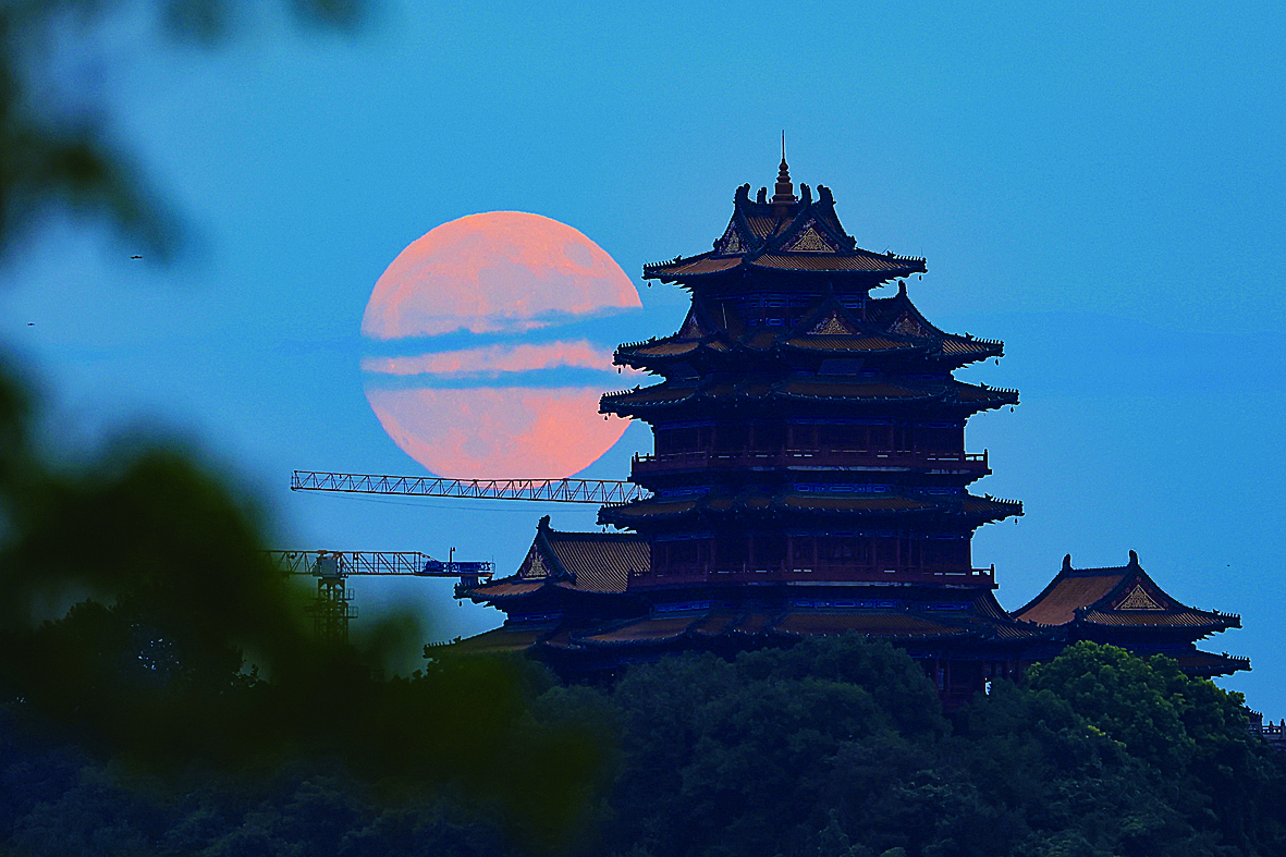 中秋月明,神州各地人们同赏一轮明月,欢度传统佳节。9月17日,圆月与南京阅江楼相映成趣。新华社发