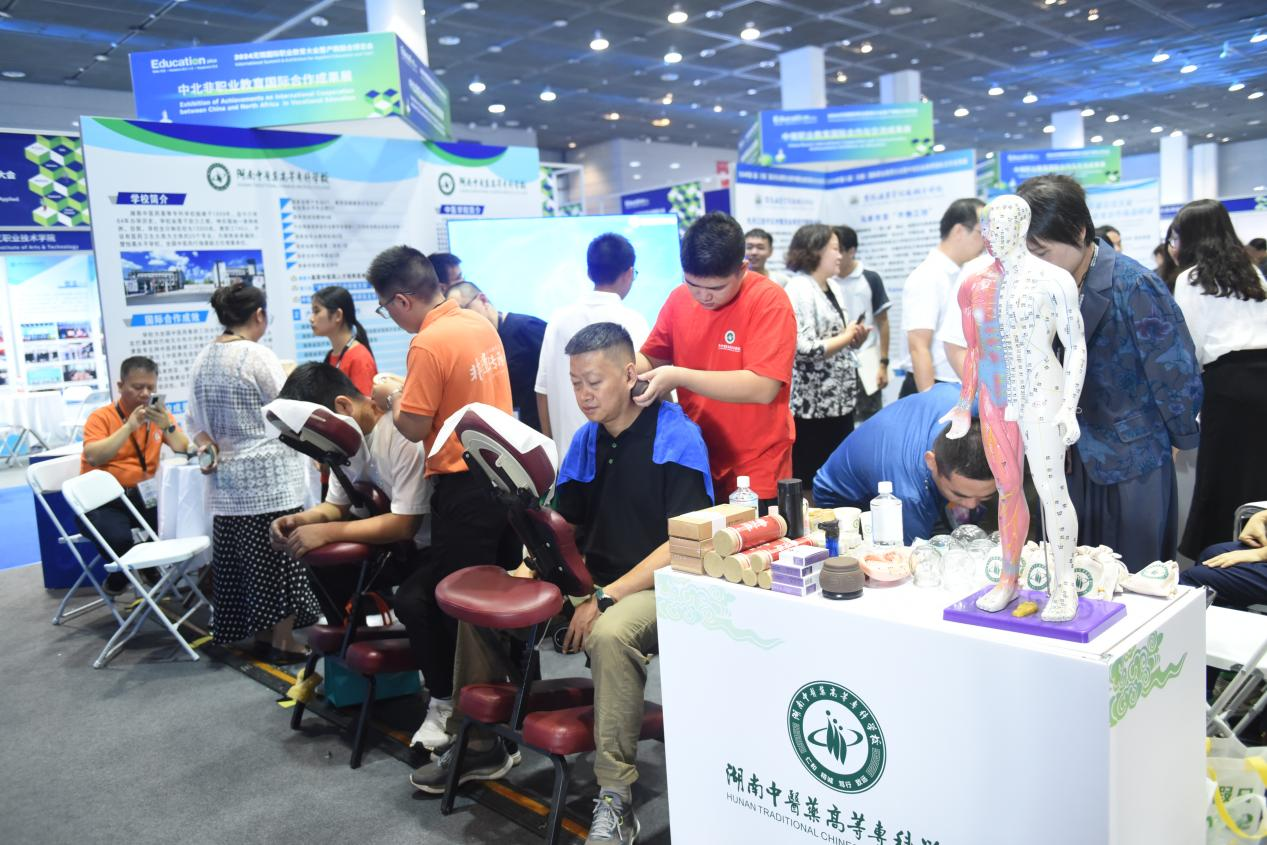 在博览会现场,“中北非职业教育国际合作成果展”湖南中医药高专展位以“养生”为主题的推拿、温刮、耳穴压豆、中药香囊、中医义诊、药膳茶饮等特色中医药服务项目,吸引了一批又一批中外友人前来排队体验,现场咨询洽谈的团队络绎不绝。