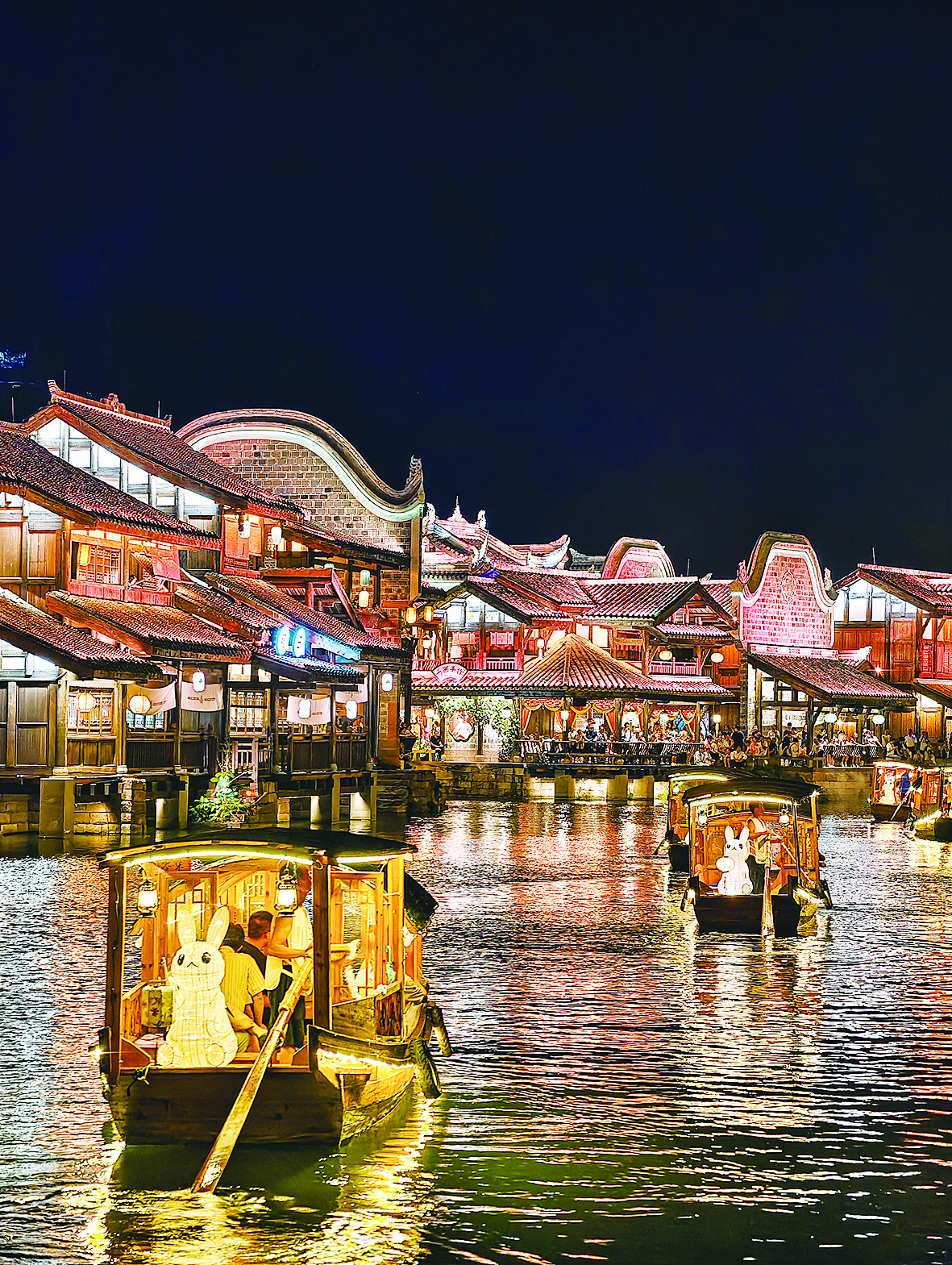 9月16日晚,在四川省宜宾市翠屏区李庄古镇,游客乘“玉兔船”泛舟慢游。 新华社发(叶昌荣 摄)