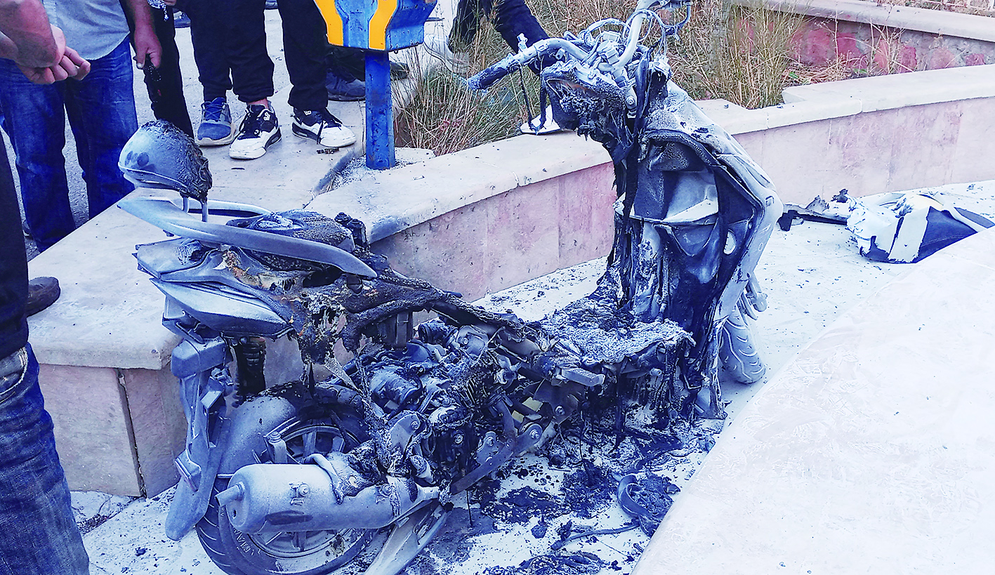 这张9月18日在黎巴嫩巴勒贝克拍摄的照片显示的是通信设备爆炸损毁的摩托车。 新华社发(塔希尔·阿布·哈姆丹 摄)