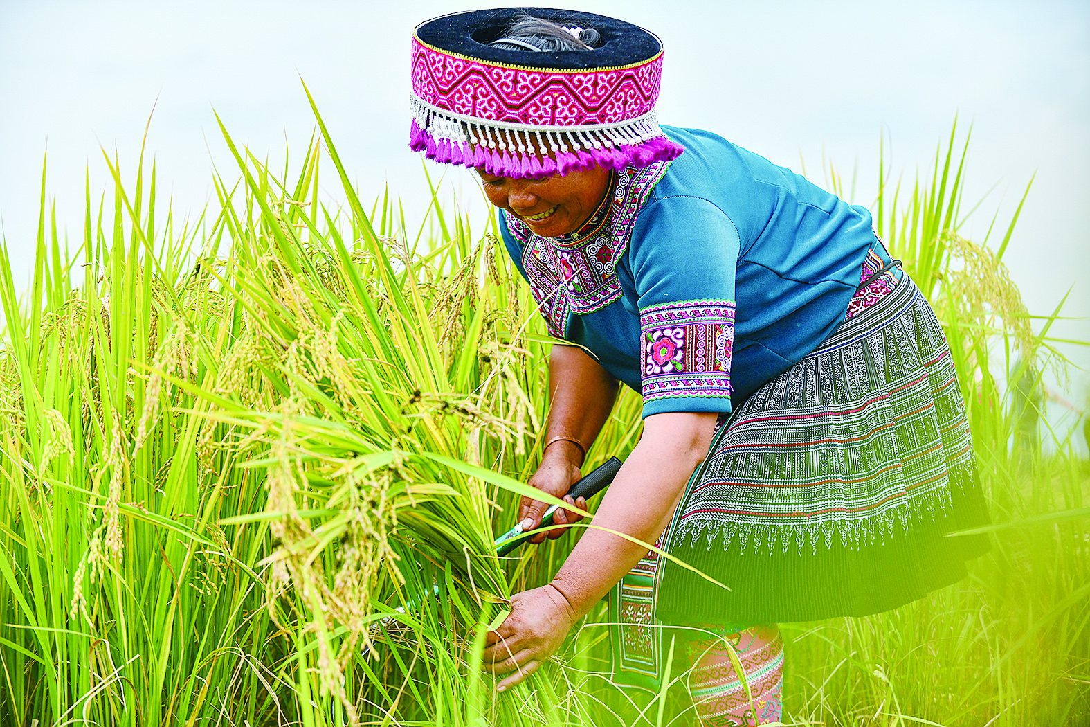 近日,位于云南省红河哈尼族彝族自治州个旧市卡房镇的旱地优质稻种植示范区迎来收获季。当地开展民俗表演、割谷比赛等活动庆祝丰收。图为9月20日,在旱地优质稻种植示范区,一名当地妇女在割稻谷。 新华社记者 王静颐 摄