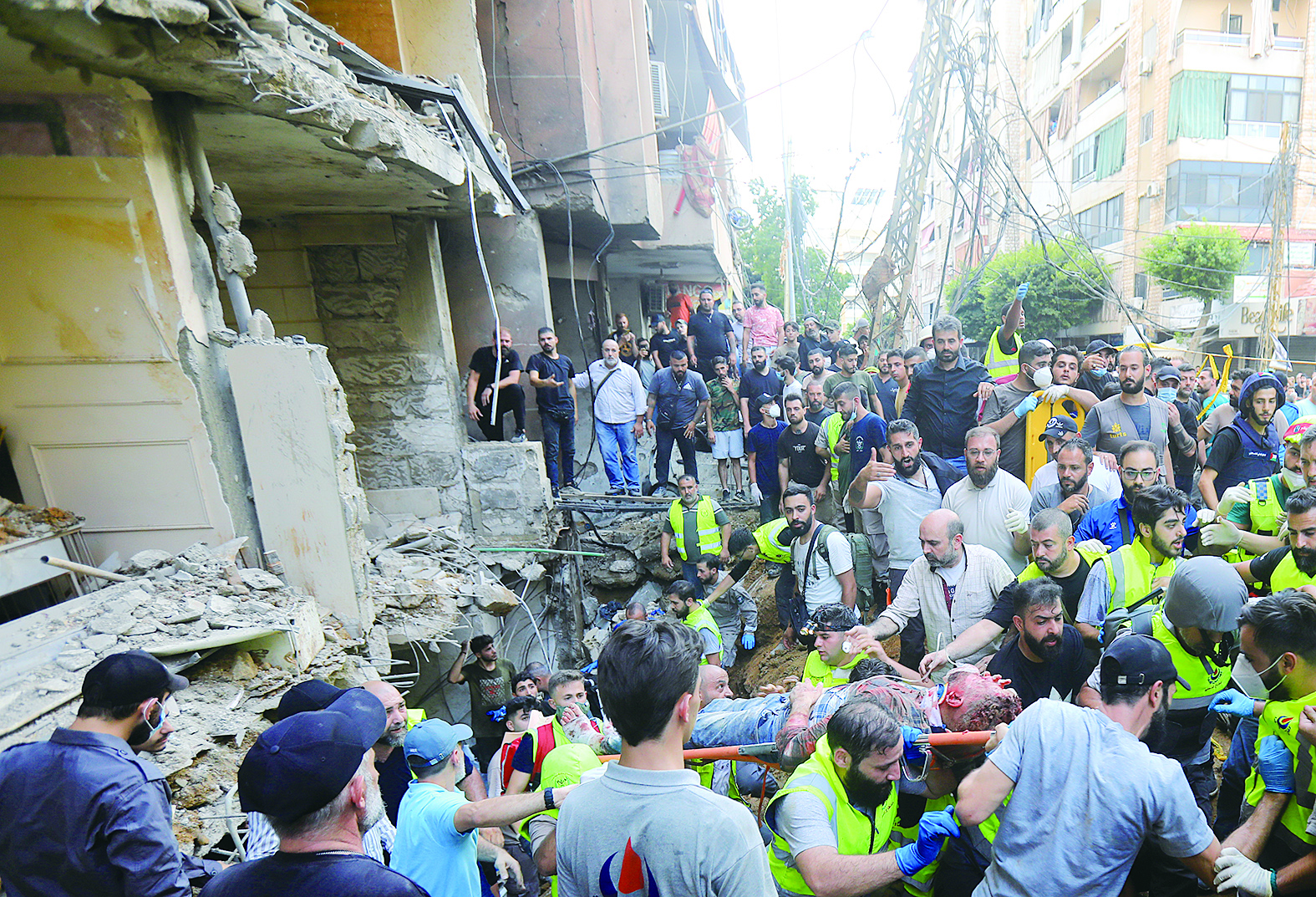 9月20日,救援人员在黎巴嫩贝鲁特南郊遭空袭现场转移伤者。 新华社发(比拉尔·贾维希 摄)
