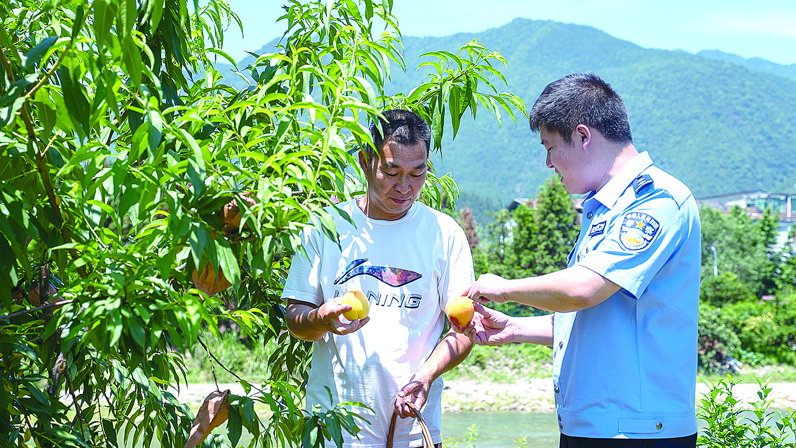 水口派出所民警走访黄桃种植户。