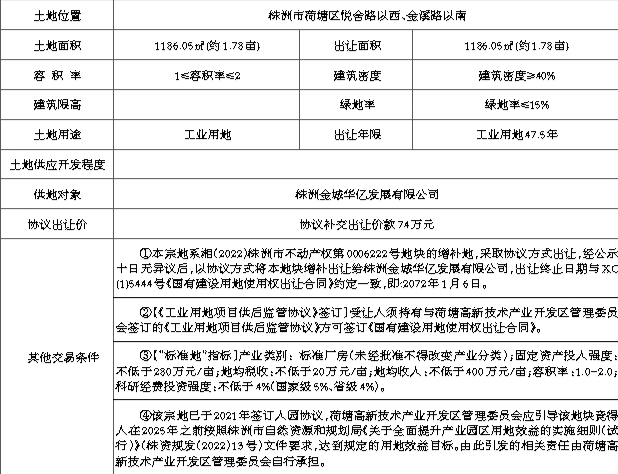 位于株洲市荷塘区悦舍路以西、金溪路以南一宗工业用地的出让方案已经荷塘区人民政府批准。从即日起向社会公开发布公告,公示期十日。主要内容如下: