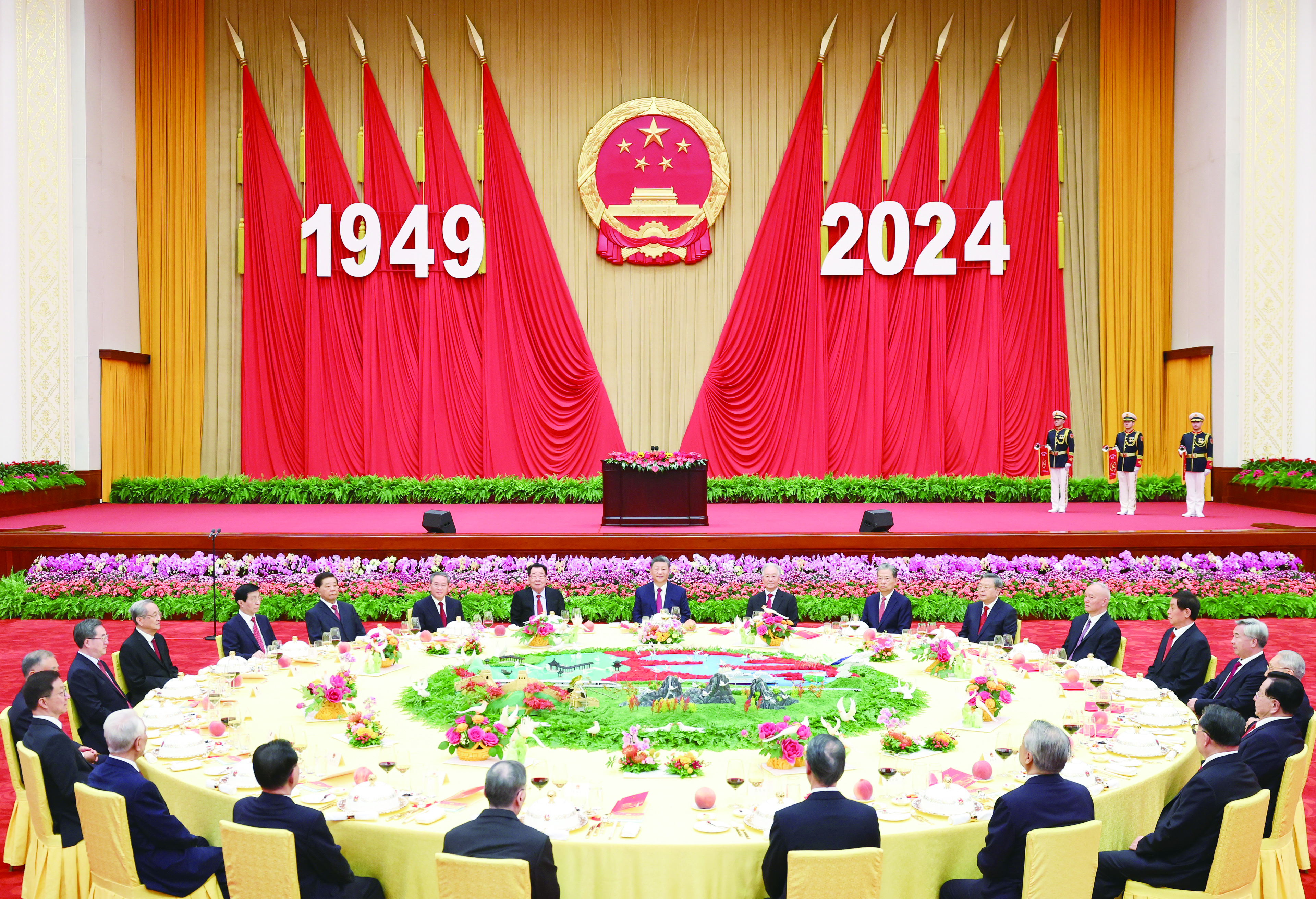 人民大会堂宴会厅华灯璀璨,洋溢着喜庆热烈的节日氛围。主席台上方高悬着庄严的国徽,“1949-2024”大字年号在鲜艳红旗映衬下格外醒目。