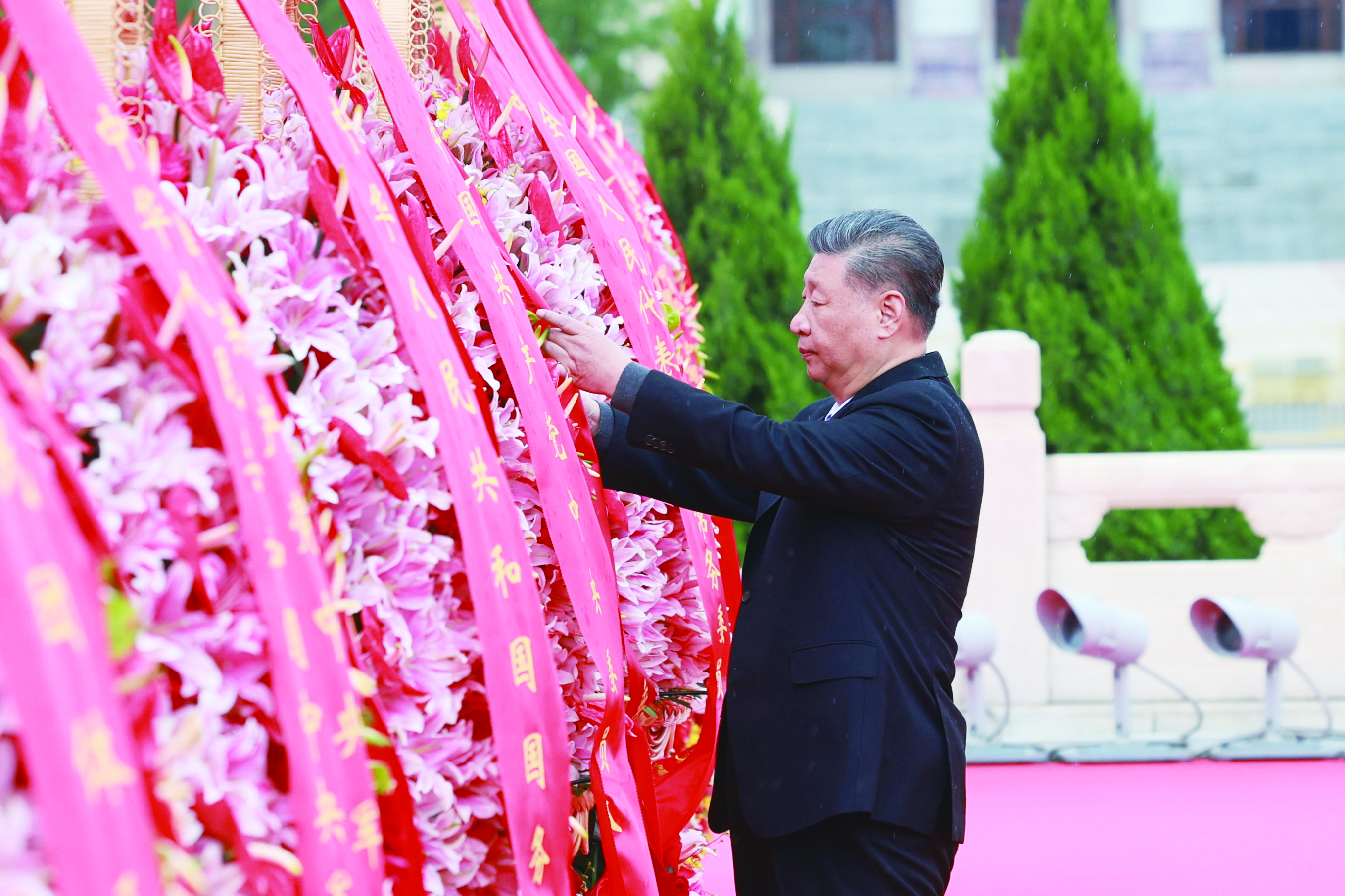 9月30日上午,烈士纪念日向人民英雄敬献花篮仪式,习近平整理花篮上的缎带。 新华社记者/王晔 摄