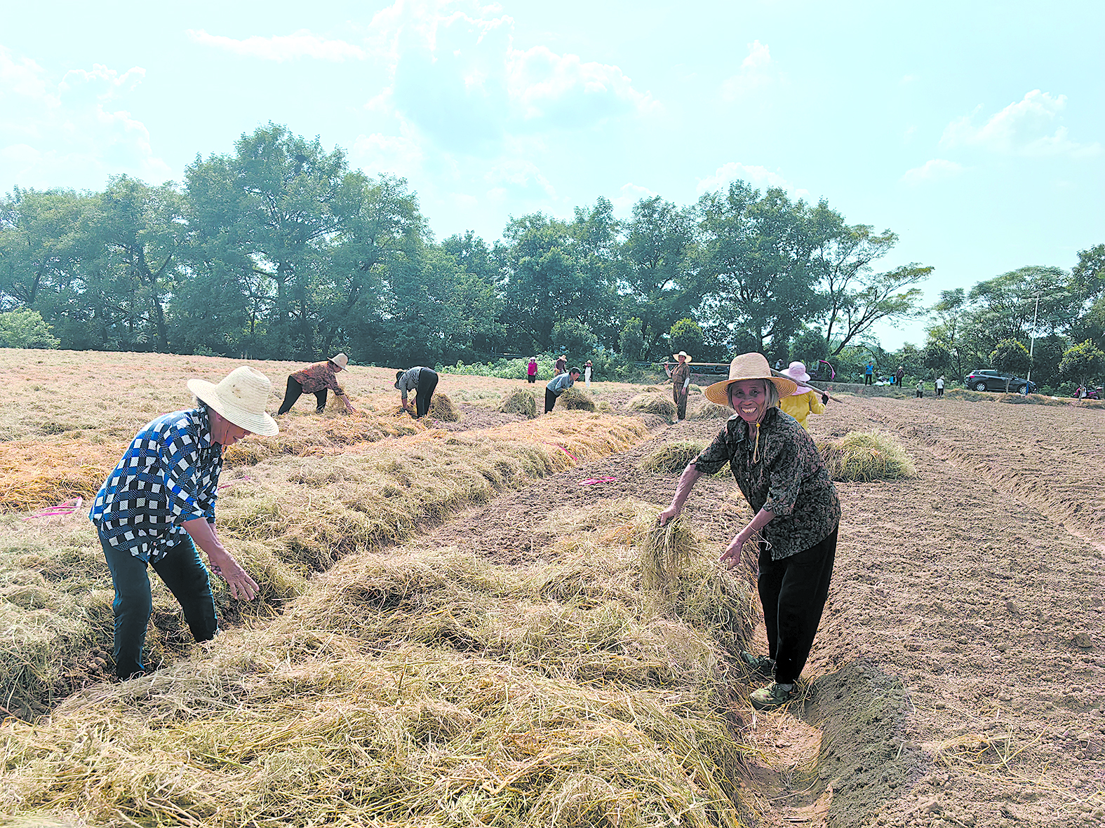 农户忙着给蒜田铺盖秸秆。记者/陈洲平 摄