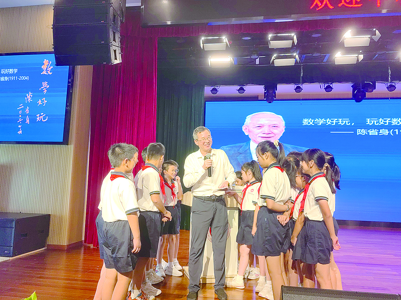 “编程也算数学吗?”“数学这么难,是什么让科学家们继续坚持钻研呢?”台下,小学生们争先恐后地向袁亚湘院士发问。袁亚湘逐一给同学们解答。