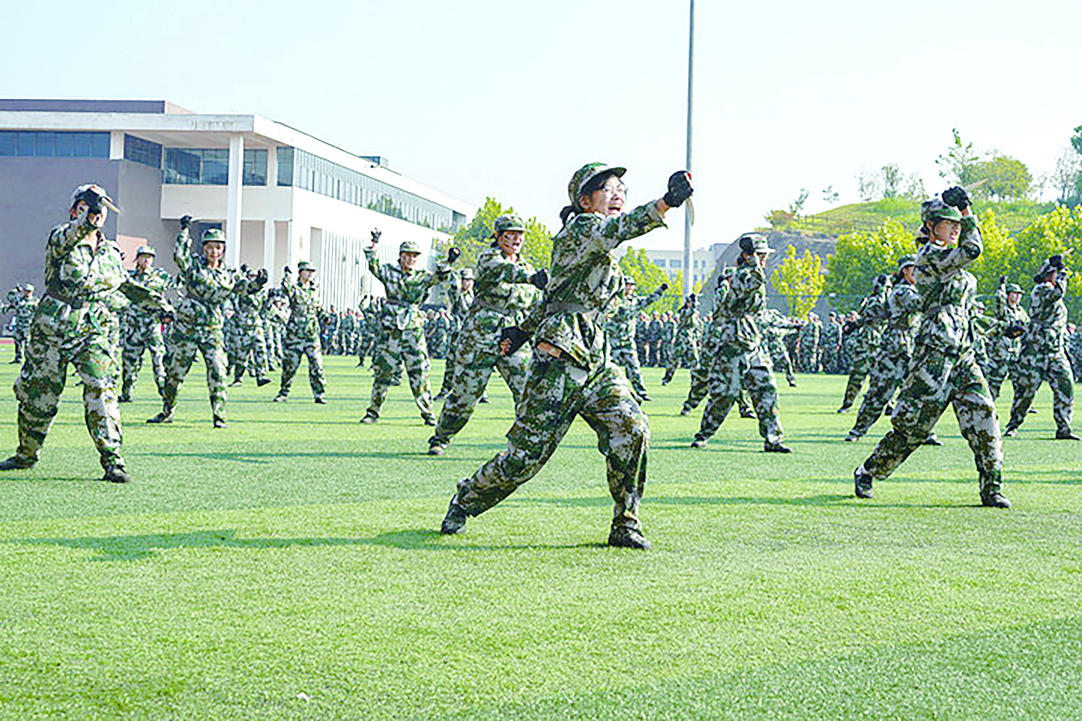 军事技能展示中,女子匕首操表演英姿飒爽,左臂向上划掌格挡在胸前,右手持匕首向前猛地刺出,同学们动作整齐划一,气势如虹。