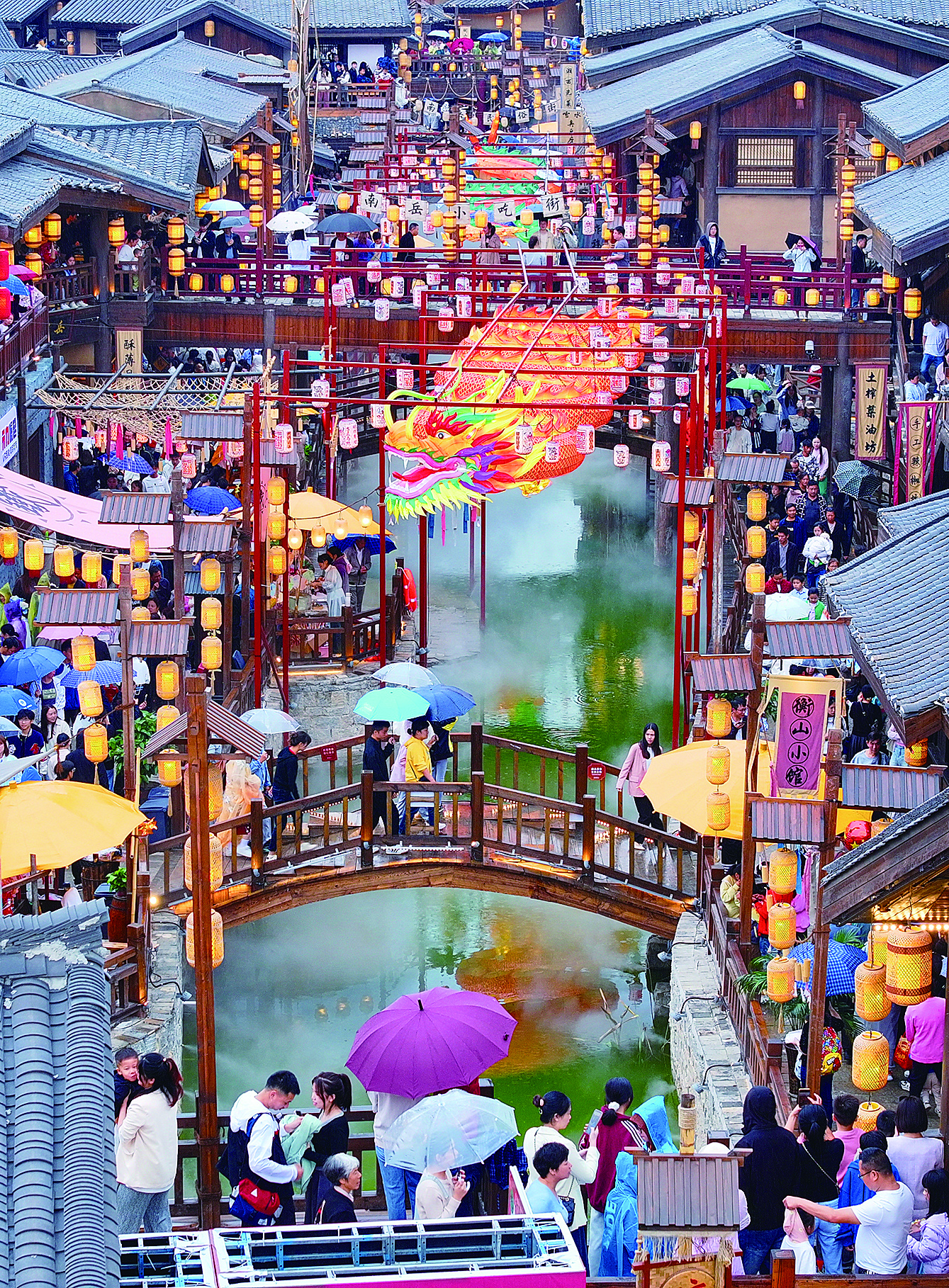 游客在湖南省衡阳市南岳区“南岳里”庙会民俗美食街区游玩,乐享假日美好时光(10月1日摄,无人机照片)。 新华社发(曹正平 摄)