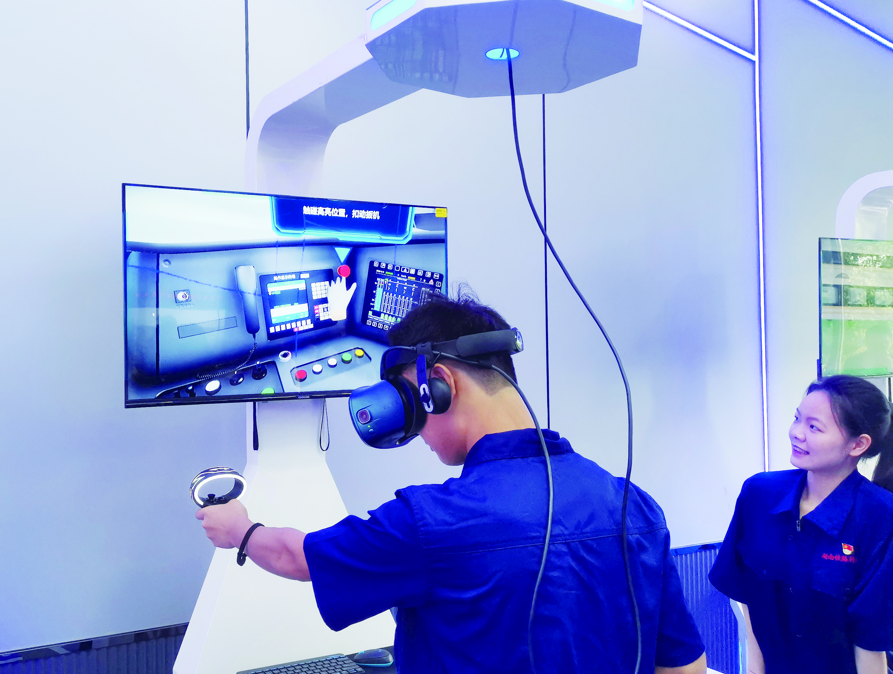 湖南铁路科技职业技术学院的学生通过VR模拟驾驶机车。 记者/戴凛 摄