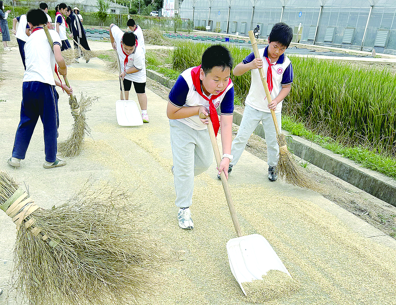 同学们收集晾晒的谷物。 记者/戴凛 摄