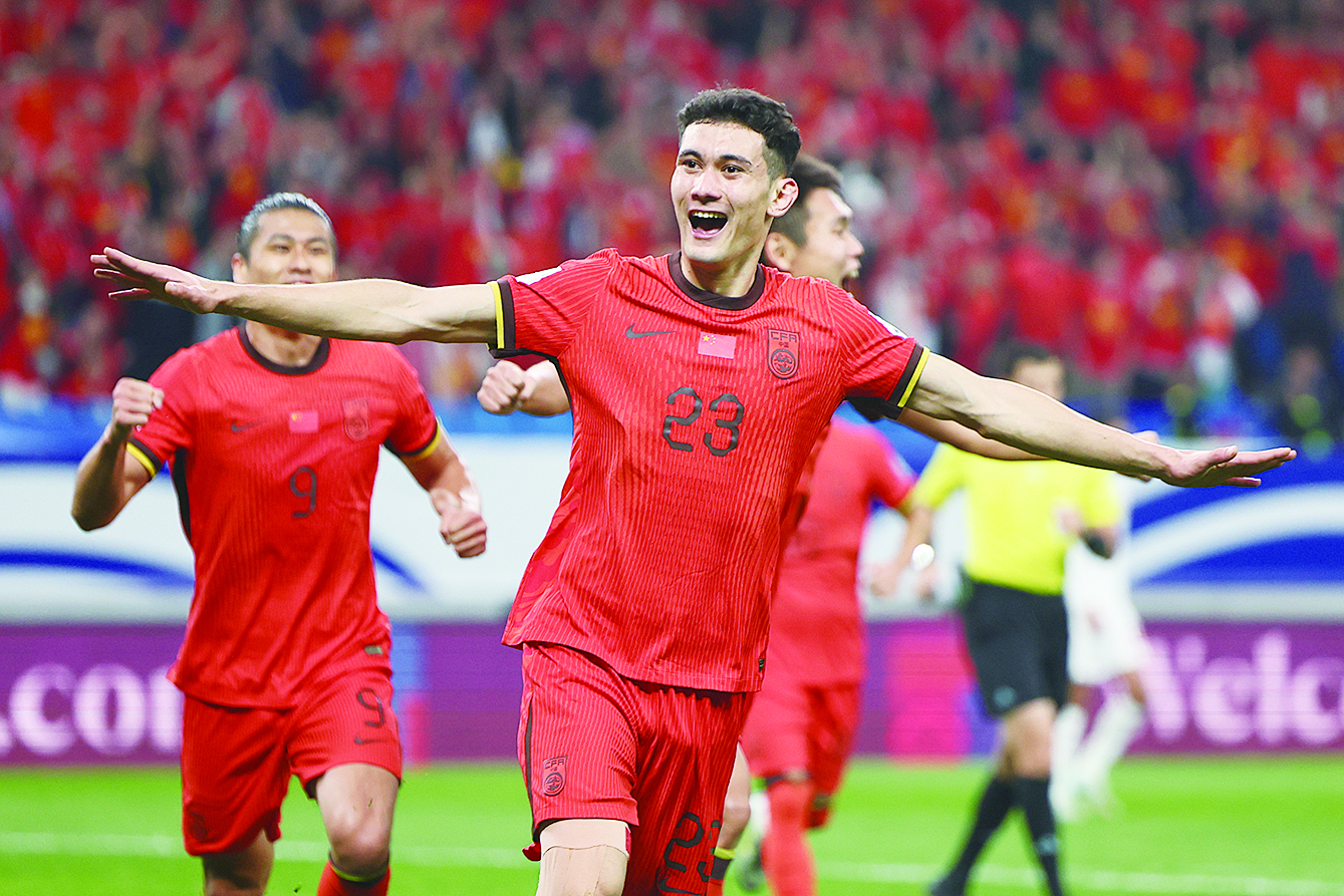 10月15日,中国队球员拜合拉木(中)在比赛中庆祝进球。 新华社记者 贾浩成 摄