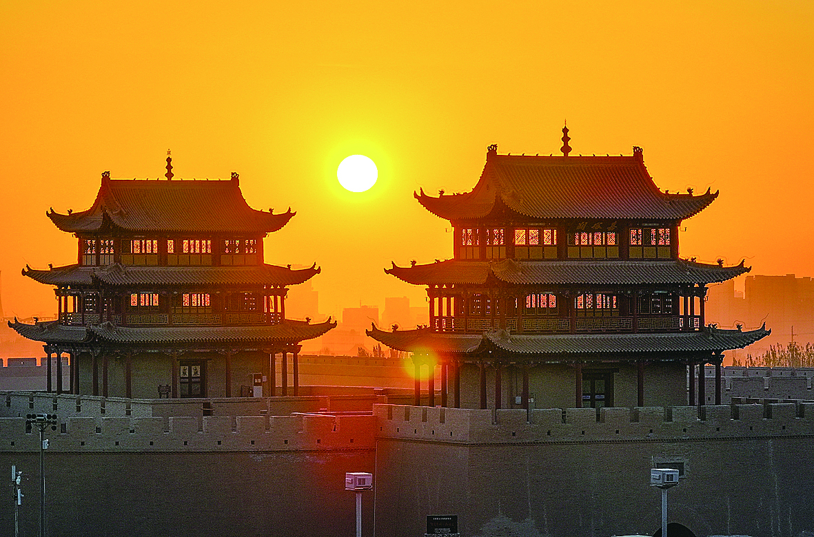 10月17日清晨在甘肃省嘉峪关市拍摄的朝阳照耀下的嘉峪关关城(无人机照片)。