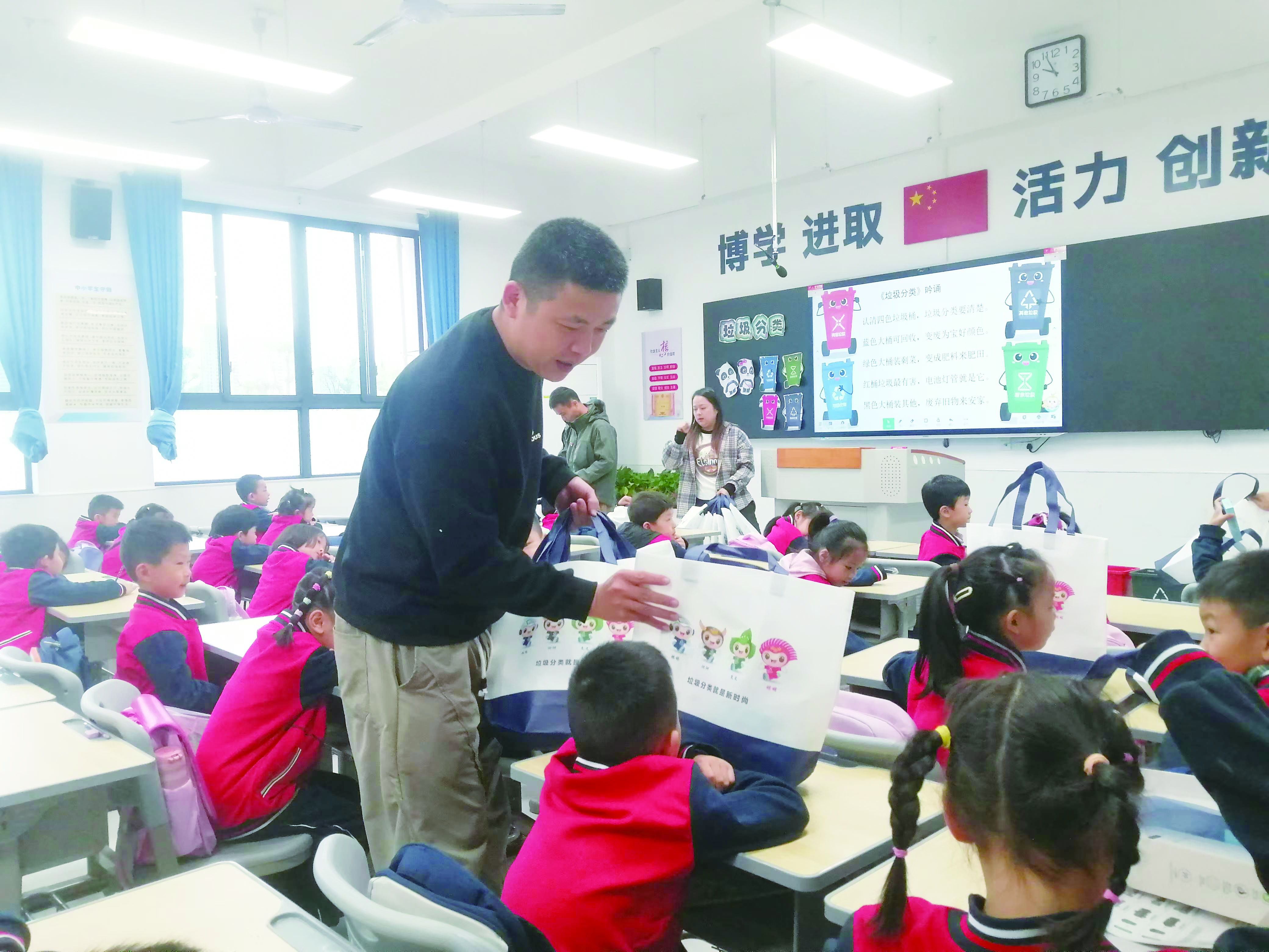 天元区环境卫生服务中心工作人员给同学们发放“环保宣传礼品袋”。 通讯员 供图