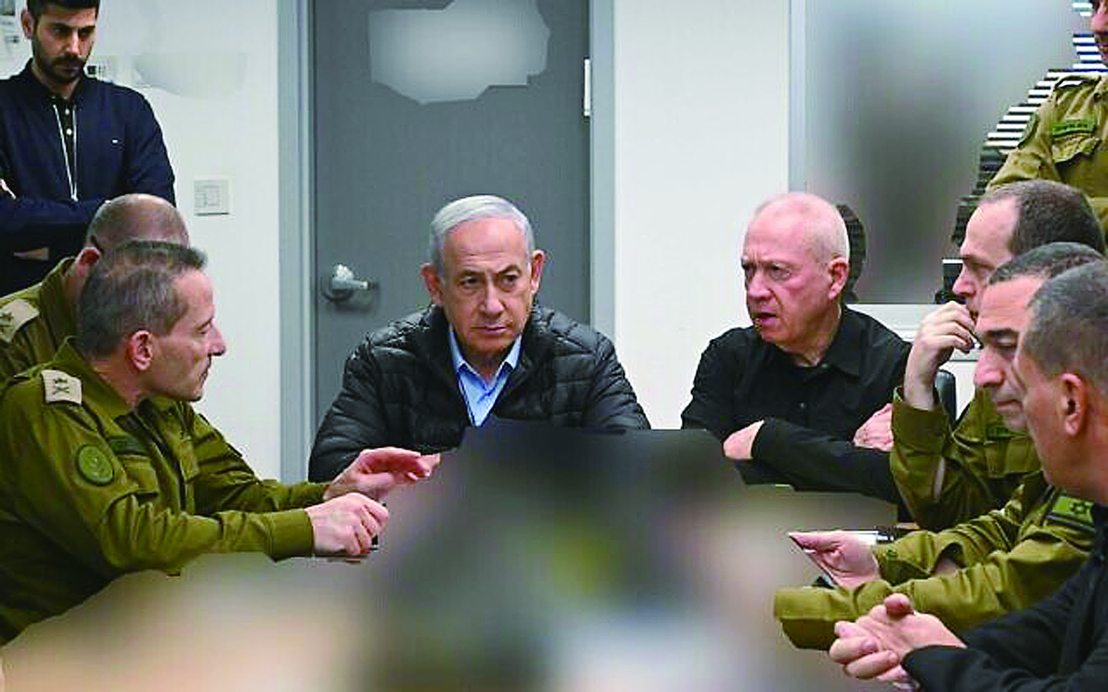 这张10月26日发布的照片显示,在对伊朗袭击期间,以色列总理内塔尼亚胡(中左)、国防部长加兰特(中右)以及国防军高级指挥人员坐在位于特拉维夫的国防军总部内。 新华社发(以色列政府新闻办公室供图)