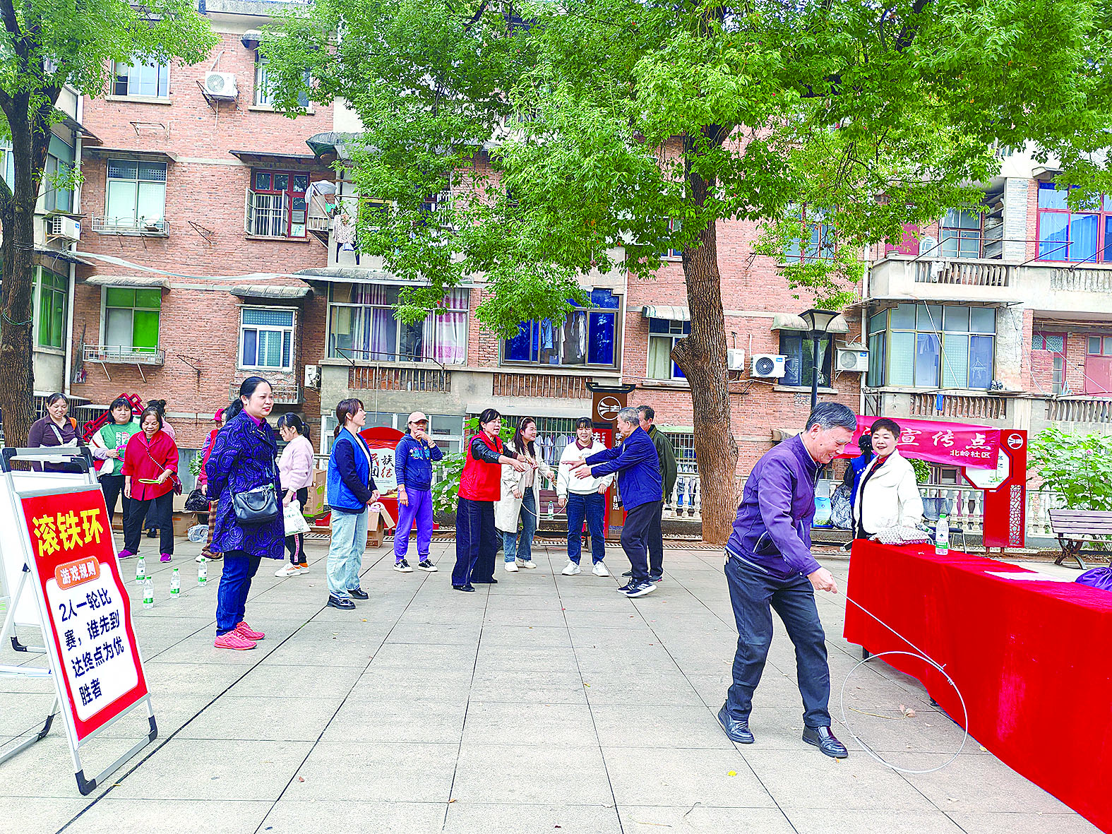 诗朗诵《共谋民族复兴路,统一战线创辉煌》、大合唱《走向复兴》激情开场,歌舞、快板、小品、戏曲,开心文艺社组织的文艺节目,逐一亮相,精彩纷呈。舞台另一边,“有奖问答”“赶鸡进笼”“套圈圈”“敲铜锣”“滚铁环”,趣味游戏活动内容丰富多彩,加油声此起彼伏。活动中间,还穿插了社区最美志愿者、优秀退役军人表彰。当天,社区网格员还协助开展创业就业政策宣传。现场热闹非凡,欢声笑语不断。