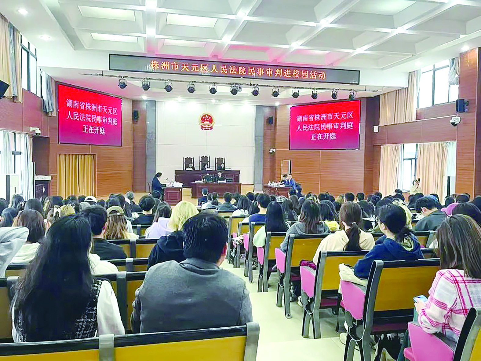 “现在开庭!”随着审判长铿锵有力的法槌声响,一起建设工程设计合同纠纷案件在湖南工业大学校园里公开开庭审理。10月28日,株洲市天元区人民法院举行“送法进校园”公开开庭活动,为湖南工业大学法学院200余名师生带来一堂“全景式”法治实践课,让在场师生“沉浸式”了解庭审。
