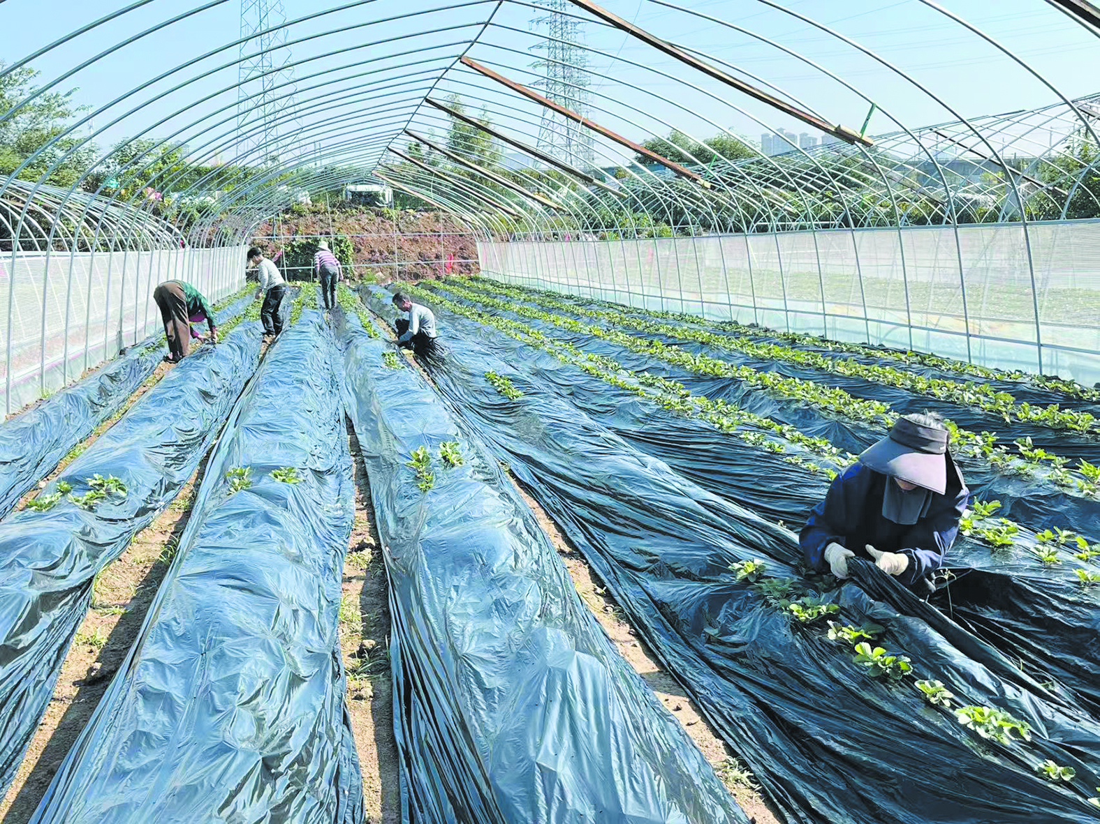 11月3日,石峰区响石岭街道金盆岭社区新白石港路涵洞以北(原白石村),26个草莓大棚内,绿意盎然,村民们正在草莓大棚里忙碌。