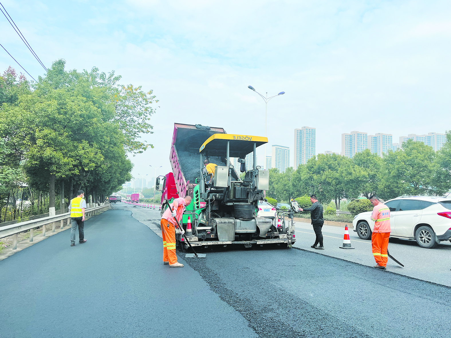 11月12日,记者在天元区泰山路与西环线交叉口沿线看到,沥青摊铺机、压路机等机械来回穿梭,市政工作人员在各种机械配合下进行沥青混凝土路面铺装工作。为保障城区道路车辆通行安全性和舒适度,近期,天元区市政维护中心对西环线、湘芸路等12条道路开展集中修缮,消除沥青路面龟裂、下沉等病害,确保道路安全通畅。