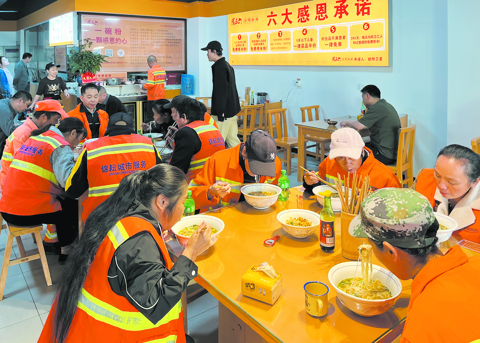 “在我遇到困难的时候,大家帮助过我,我也要回馈社会。”店主欧阳卫星来自渌口区,从事餐饮行业已经多年。他介绍,“阳五六”炒码粉铺于今年8月开业,每天坚持为环卫工人、75岁以上老年人等提供免费早餐,店前还设了休息区,专门为过往行人提供免费茶水。接下来,还计划在店内设一个便民服务点,向快递员、环卫工人、市政人员等户外劳动者及其他市民免费提供手机充电、伞具借用、午休场地等服务。图为环卫工人在店内免费就餐。