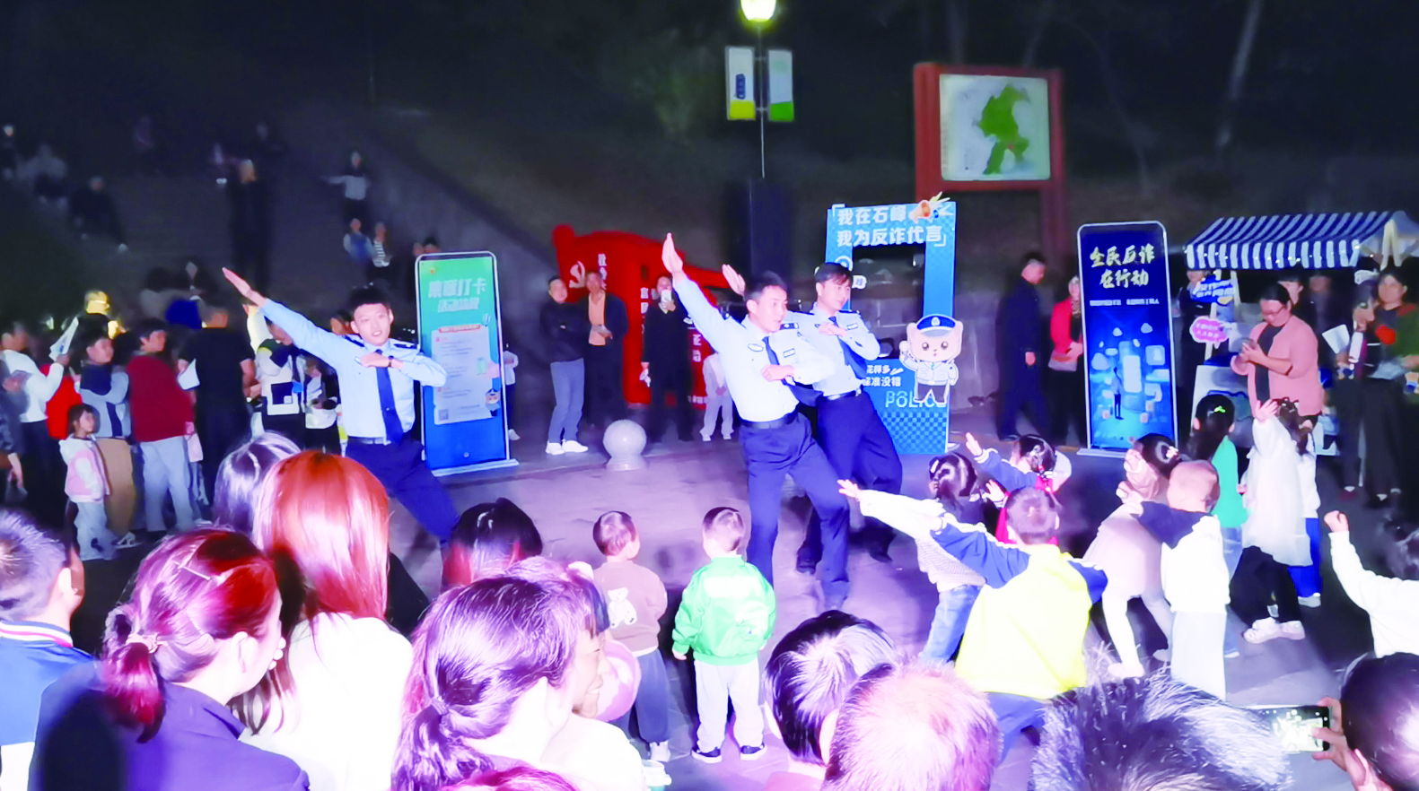 株洲日报讯(全媒体记者/杨如 通讯员/贺晓敏) 10月30日晚,民警巡演街头跳起“科目三”,小朋友全程跟着节奏舞动,很带感!这是市公安局石峰分局在响石岭街道开展的巡演活动现场。民警们通过群众喜闻乐见的“花式”表演开展普法宣传,吸引了众多居民朋友的眼球,进一步提高了群众禁毒、反诈、打谣等意识。