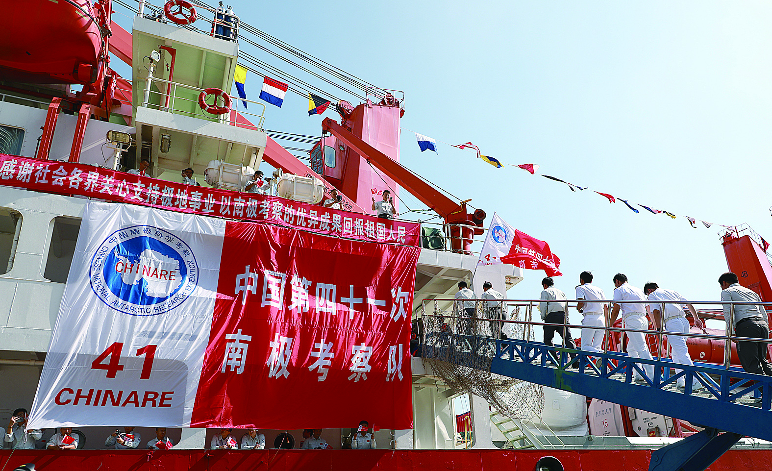 图为11月1日,在广州南沙国际邮轮母港码头,中国第41次南极科学考察队队员登船准备出征。据新华社
