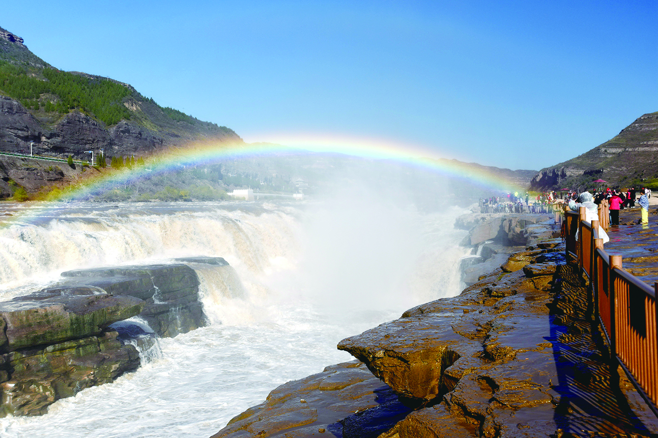 深秋时节,受水库调节放水影响,位于山西吉县和陕西宜川县交界的黄河壶口瀑布水量增大,飞溅的水雾在阳光的照射下,形成“彩虹桥”景观。