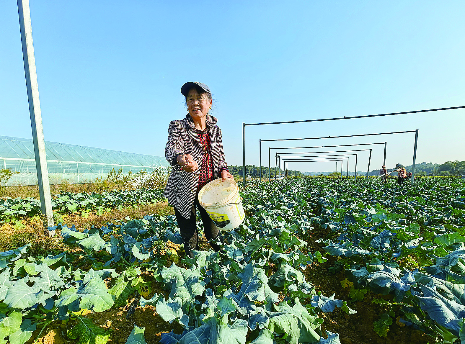 村民正在给西蓝花施肥。记者/邹怡敏 摄