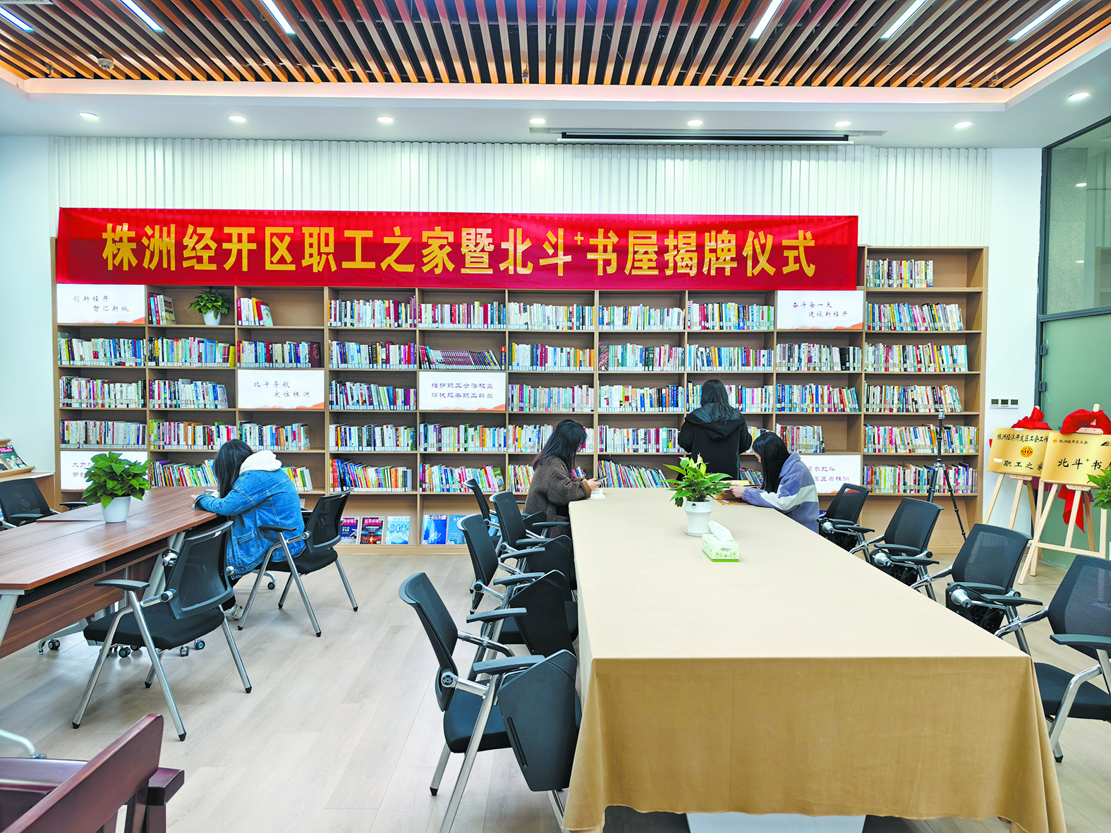 “北斗+”书屋位于株洲经开区管委会大楼一楼,藏书约5000余册,涵盖了文学、科技、艺术、少儿读物等多个领域。书房内还配备了自助借还系统,方便市民一键借还。“北斗+”书屋是我市第5座城市书房。