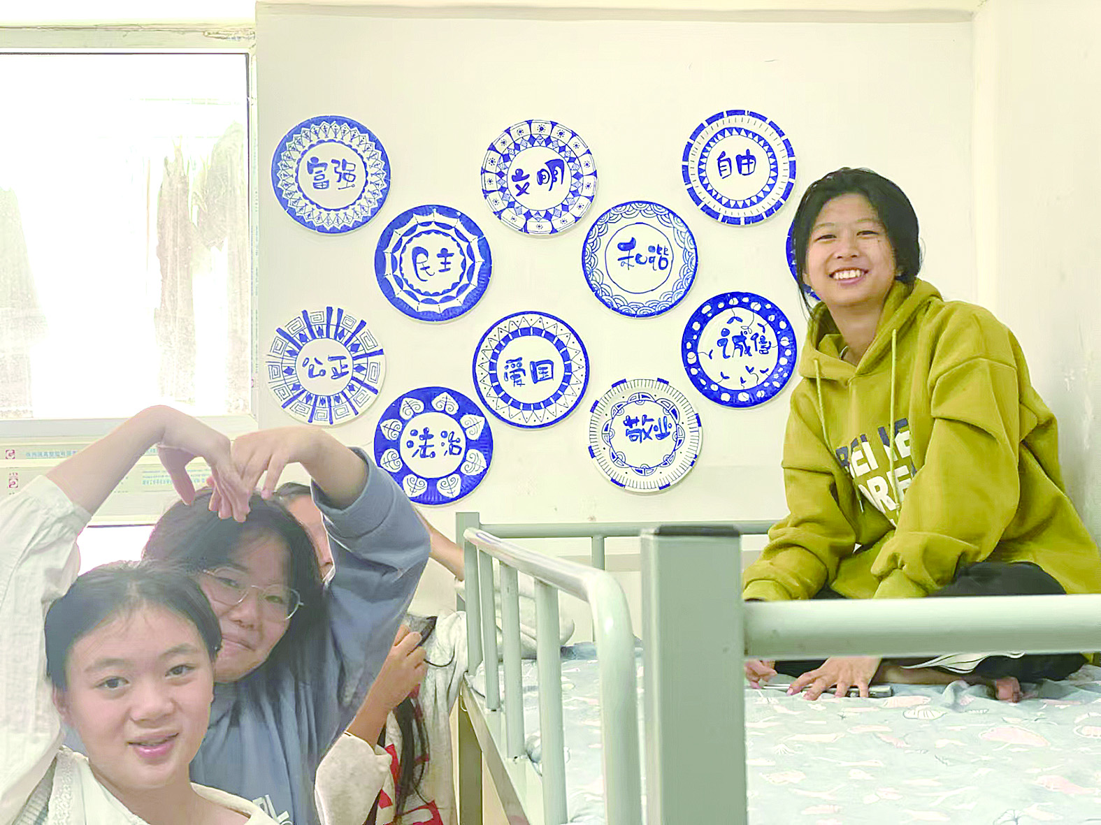 她们的寝室布置风格以简洁明了为主,特别显眼的是墙上一组手工绘制的拥有不同纹样的“社会主义和谐价值观”纸盘。