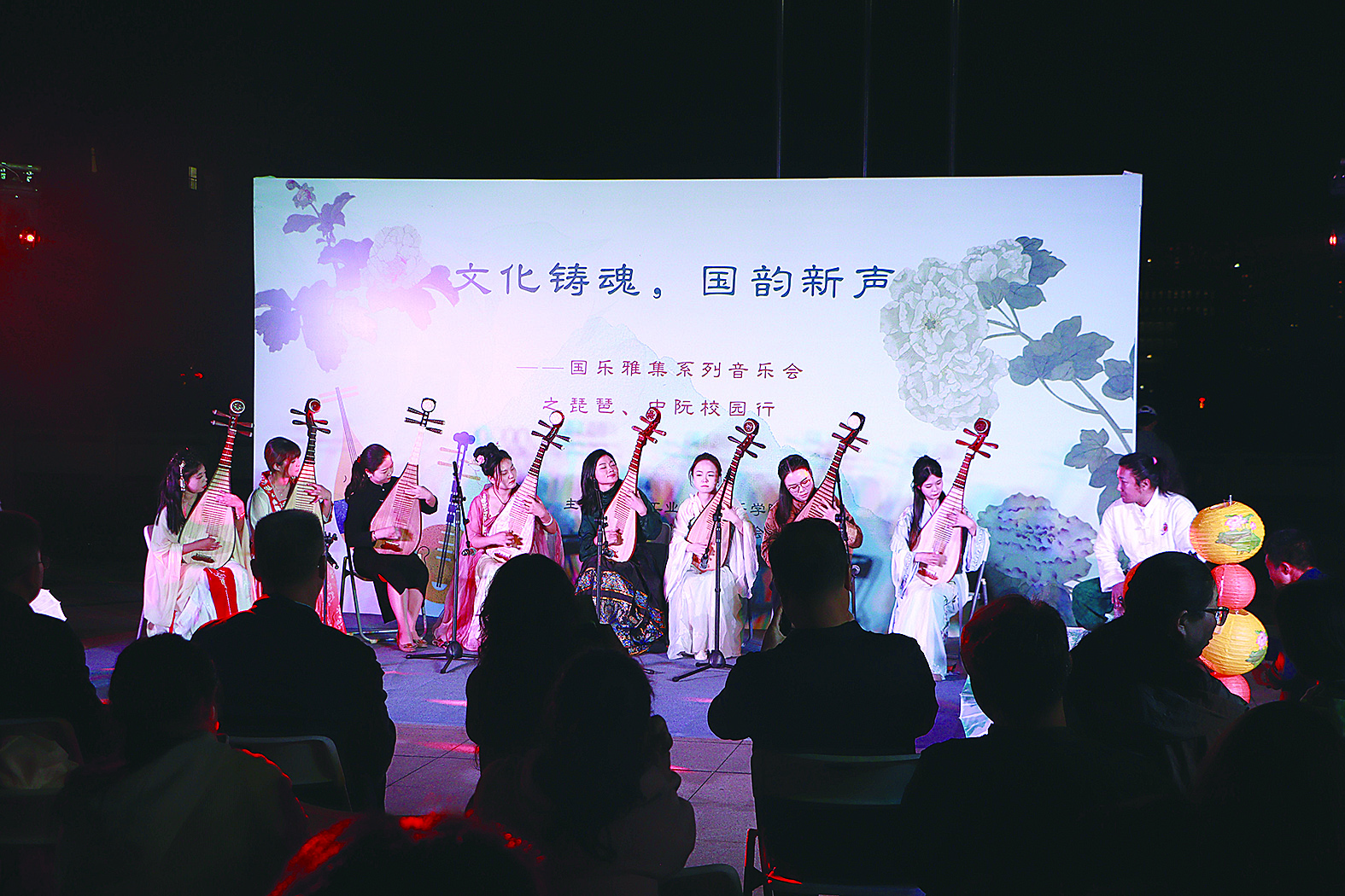 现场,参与者身着汉服,仿佛将观众带入了古代的音乐殿堂。在琵琶重奏《阳春白雪》和中阮重奏《彩云追月》的悠扬旋律中,传统经典曲目精彩上演。