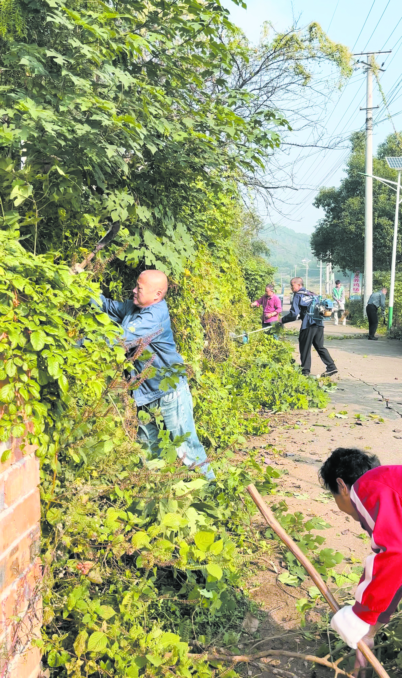 东园村由原东流村和原茶园村合并组成,现有村民小组29个。此次整治行动开展前,不少乡村道路,草木茂盛,使道路“变窄”,影响到村容村貌及村民出行。图为乡村道路上一片繁忙景象。