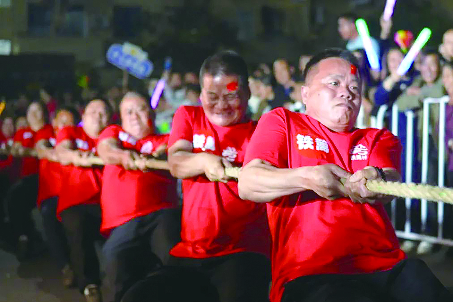 据悉,当晚赛事是全区第二场邀请赛,前来参赛的队伍质量明显高于首轮战队。“大力士们”个个牙关咬紧、满面通红、眼睛瞪得溜圆,一副要将对手“秒杀”的表情,令人忍俊不禁。无论是两边对手力量相持,还是被对手“拔翻”在地,都展现出队员们对胜利的强烈渴望,一次次激战后,长绳缓缓偏向一方,胜利的欢呼瞬间响彻乡间的夜空。