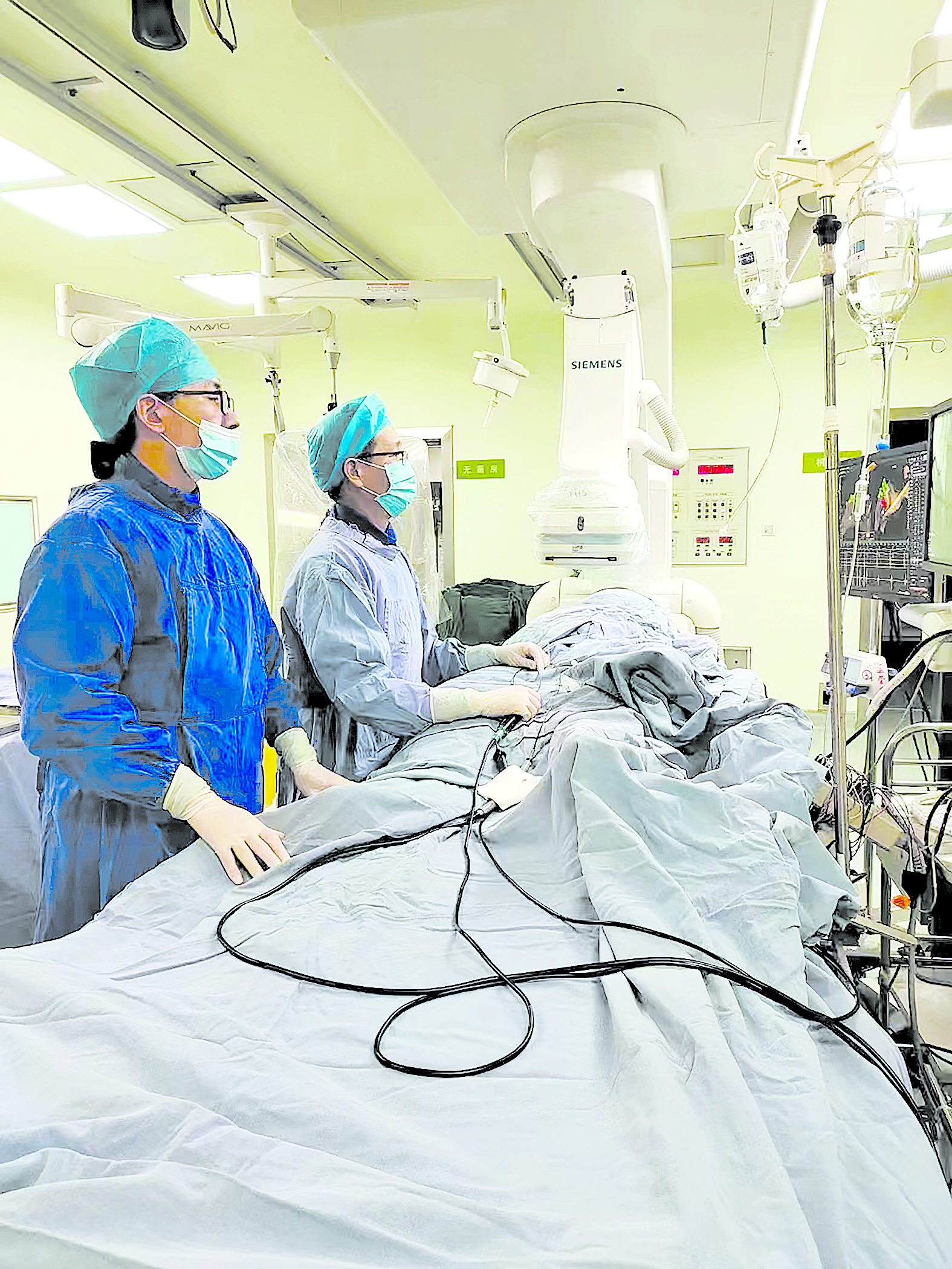 ▲符晓磊医师带领团队对患者实施导管联合导丝消融术。