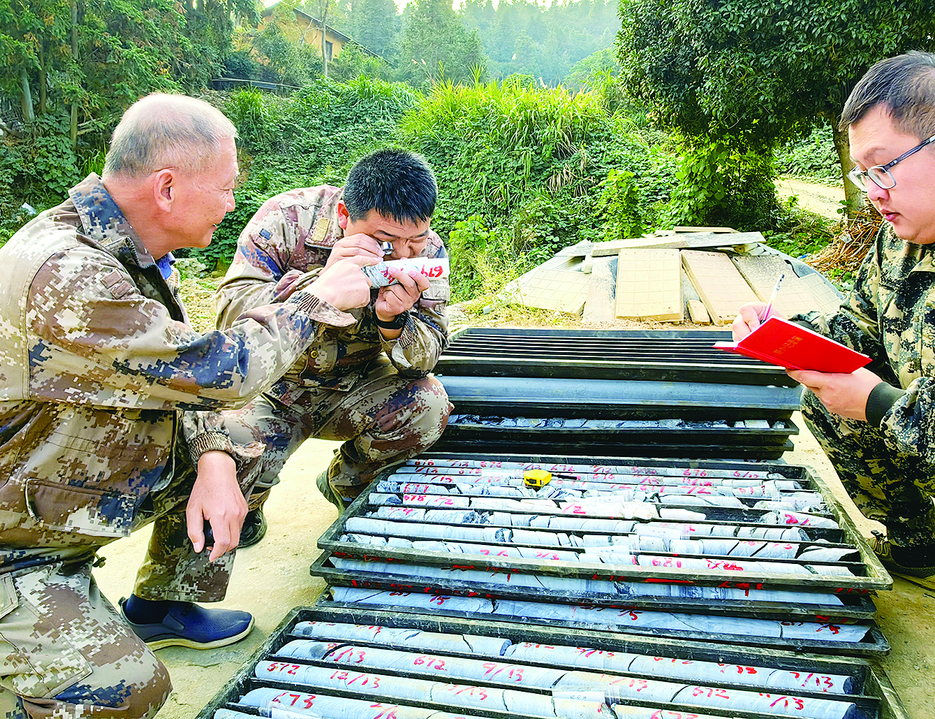 图为11月5日,湖南省地质灾害调查监测所探矿队技术人员在分析岩石样本。