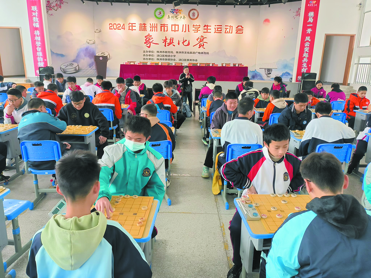 11月23日,株洲市2024年中小学生运动会象棋比赛在渌口区明德小学激情开赛。来自全市各学校的200余名选手“棋”聚一堂、捉对厮杀,在方寸之间展开博弈。