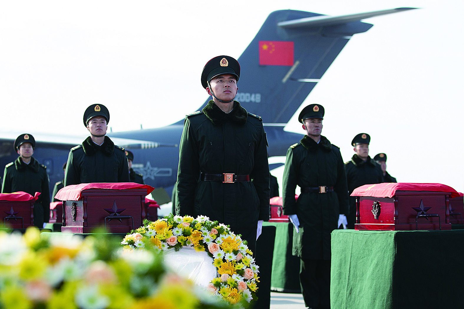 11月28日,在沈阳桃仙国际机场,礼兵将殓放志愿军烈士遗骸的棺椁从专机上护送至棺椁摆放区。新华社发(韩启扬 摄)