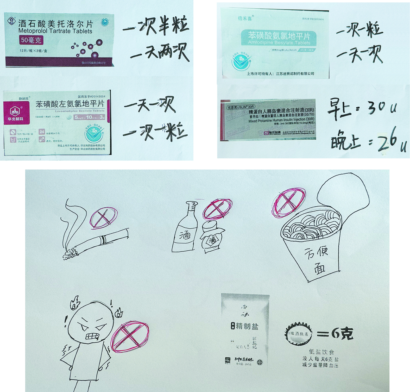 为此,95后谭燕姿将老人服用的常用药的包装打印在A4纸上,用图画、数字标记出每日用药量;想到老人不识字,她还把“不要抽烟、喝酒”“不吃方便面”“少生气”等字眼,换成漫画的形式,贴在老人家的柜子上,提醒着健康生活方式的重要性。